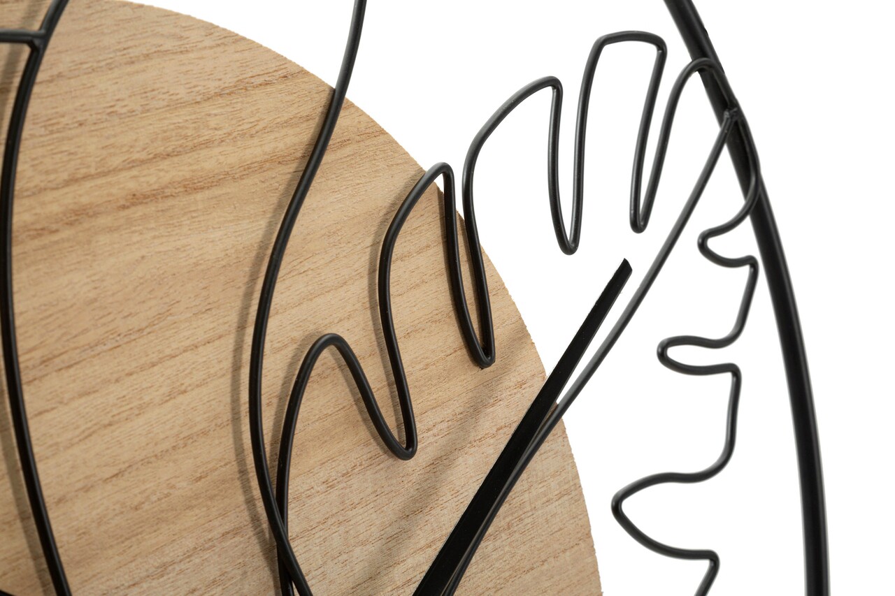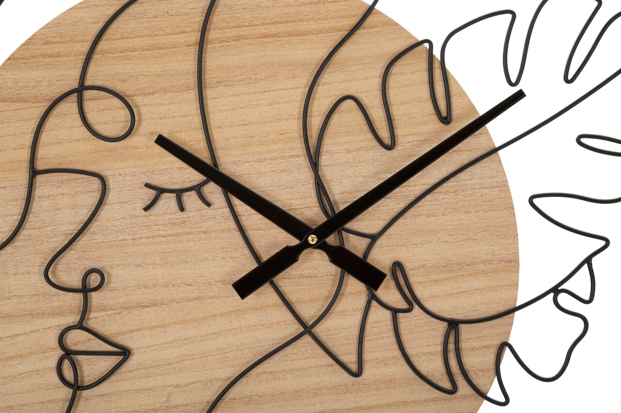 Ceas de perete rotund din metal si lemn, cu linii delicate si sinuoase care alcatuiesc un chip si frunze. Functioneaza cu o baterie AA care nu este inclusa.