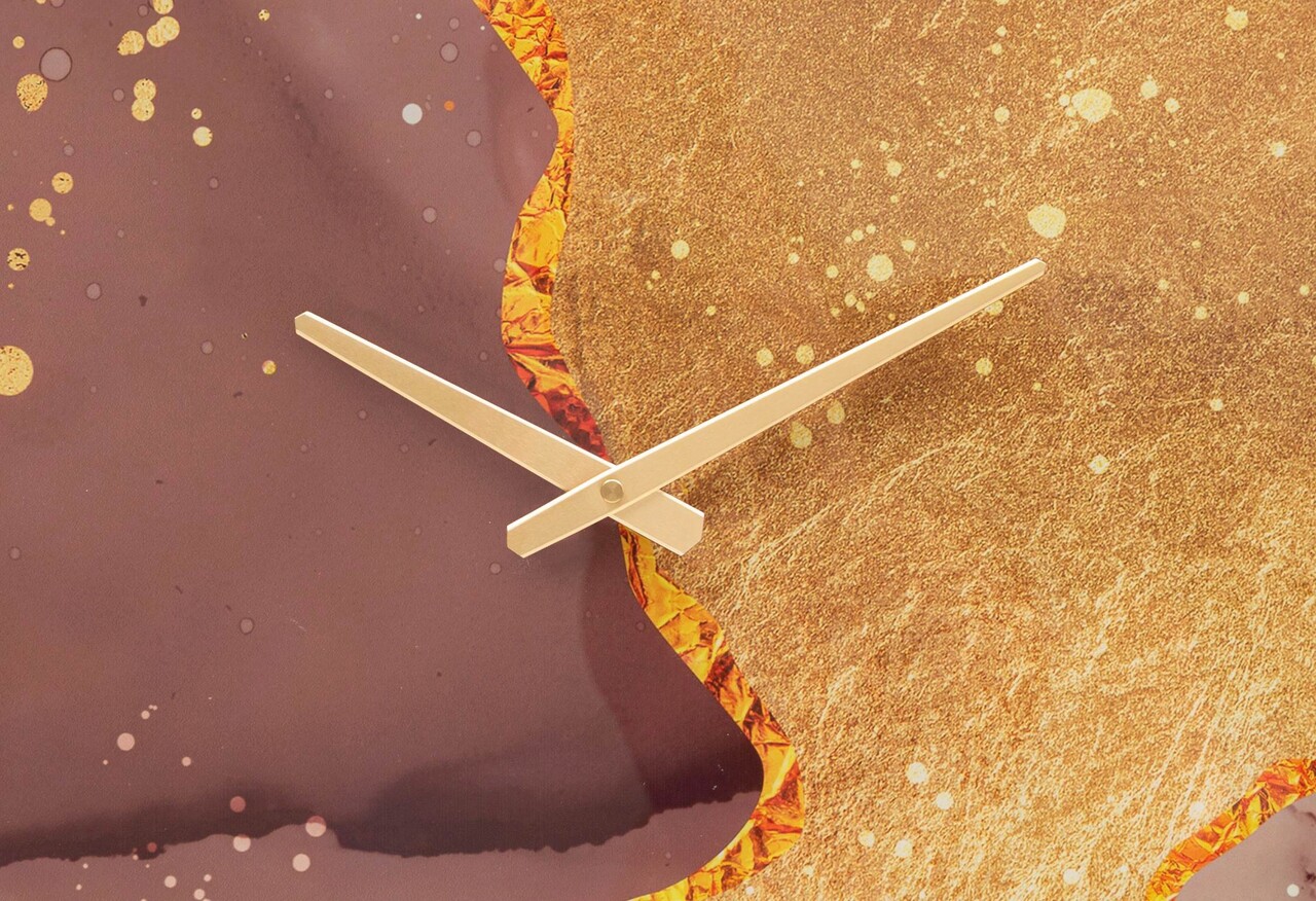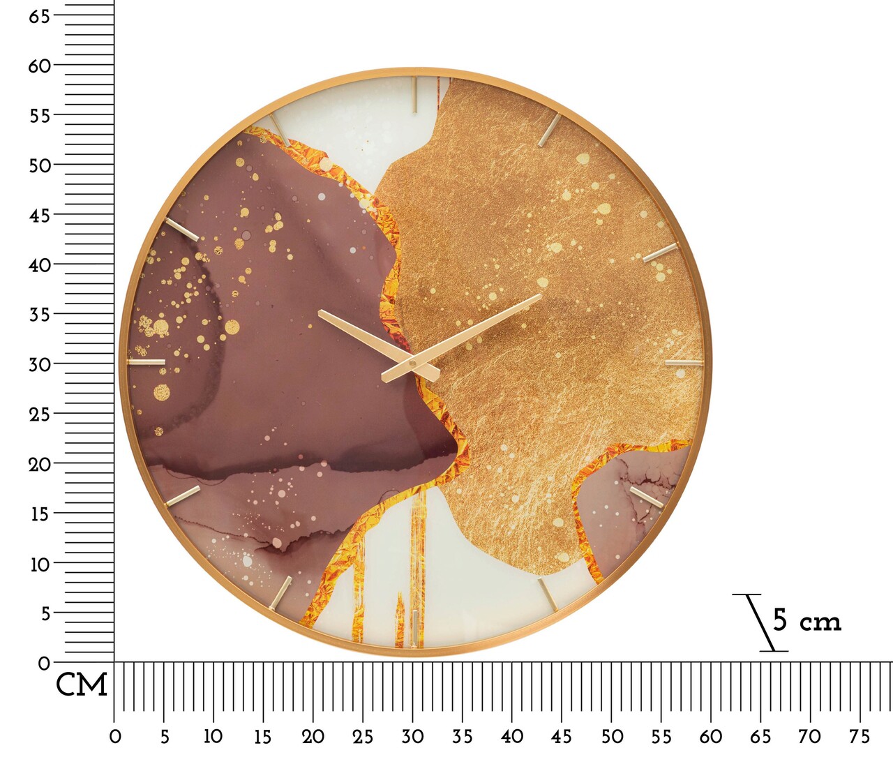 Ceas de perete rotund, cu rama aurie eleganta si cadran decorat in tonuri vii si luminoase. Compozitie material: sticla, MDF, metal. Functioneaza cu baterii AA, neincluse.