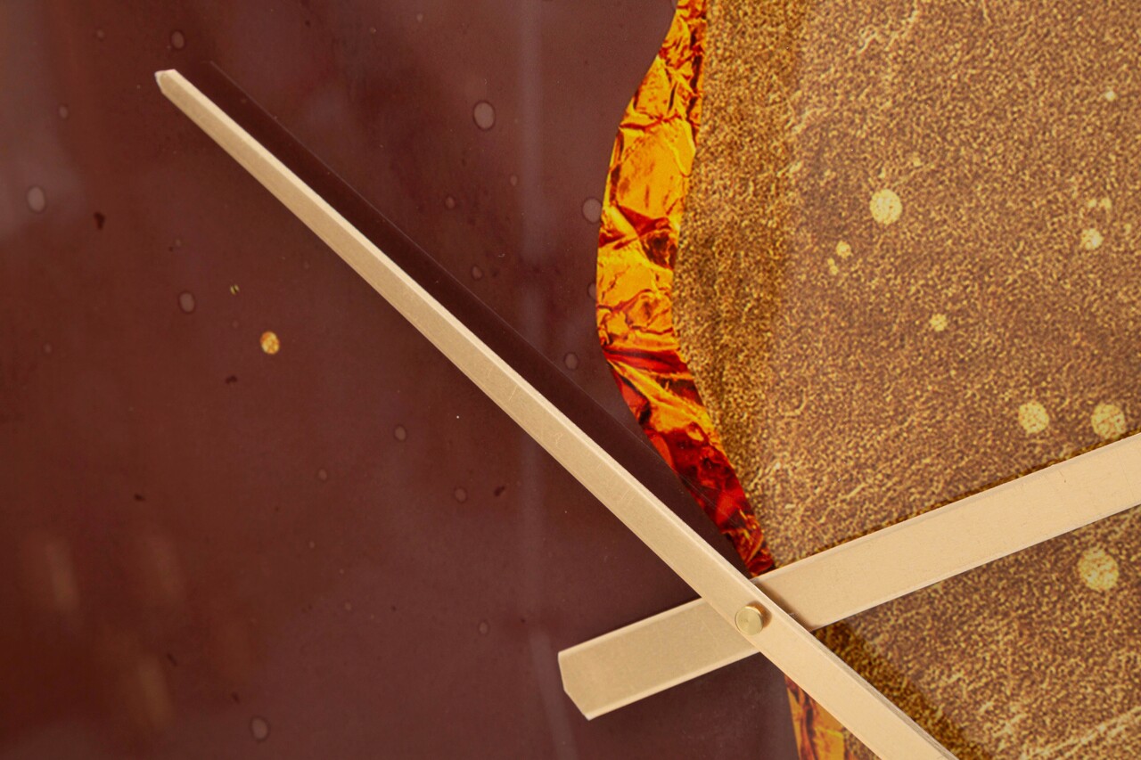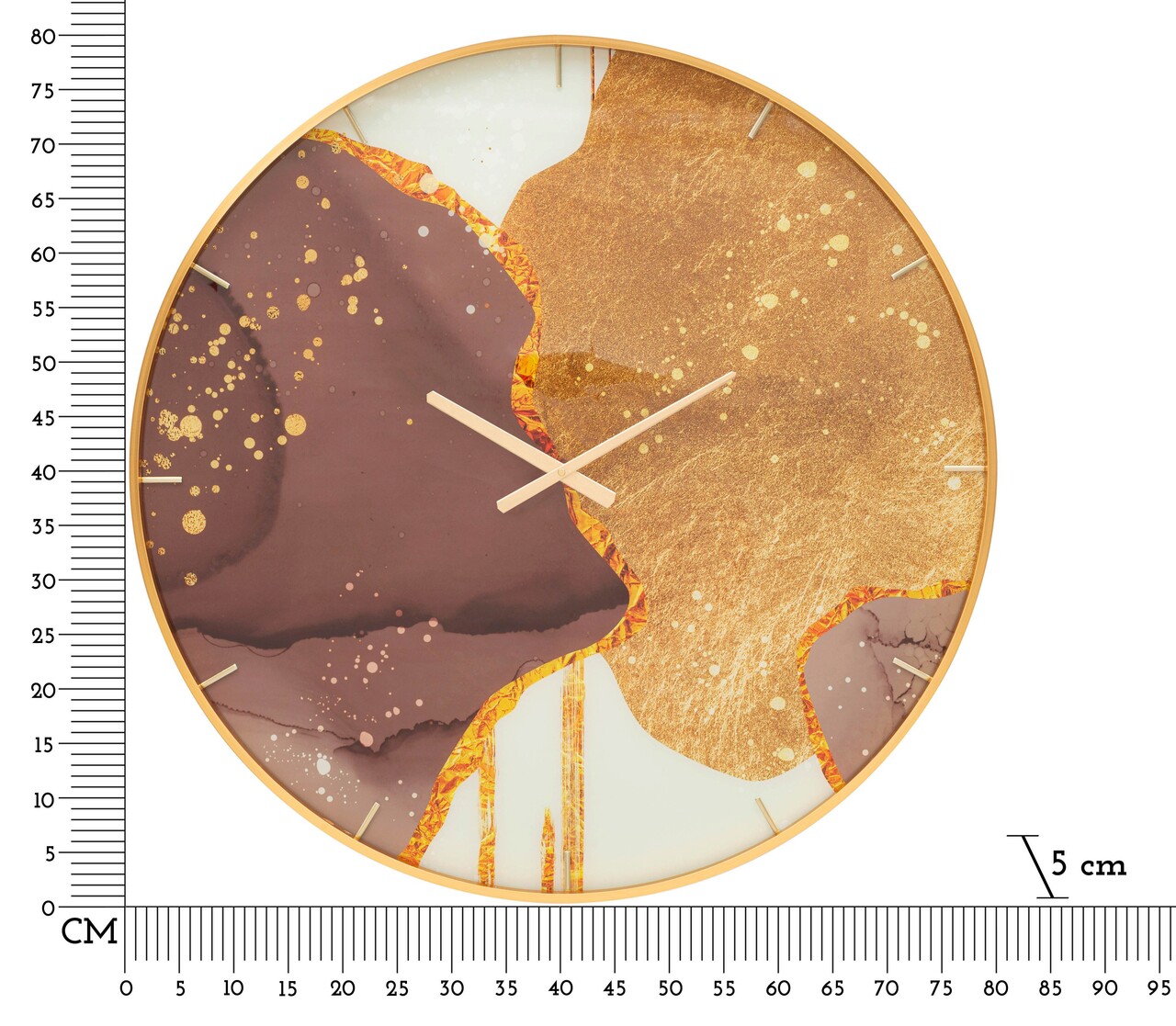 Ceas de perete rotund, cu rama aurie eleganta si cadran decorat in tonuri vii si luminoase. Compozitie material: sticla, MDF, metal. Functioneaza cu baterii AA, neincluse.