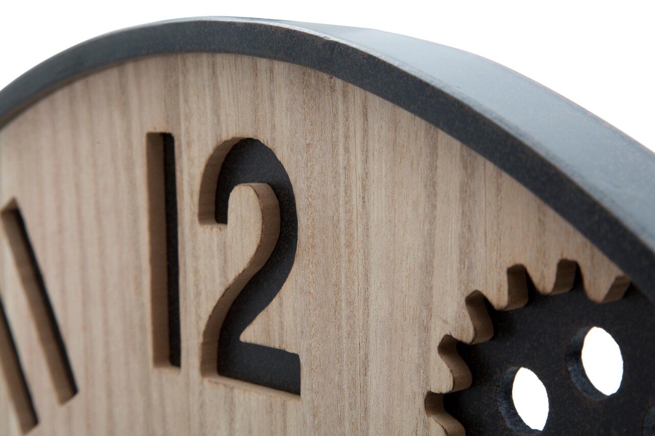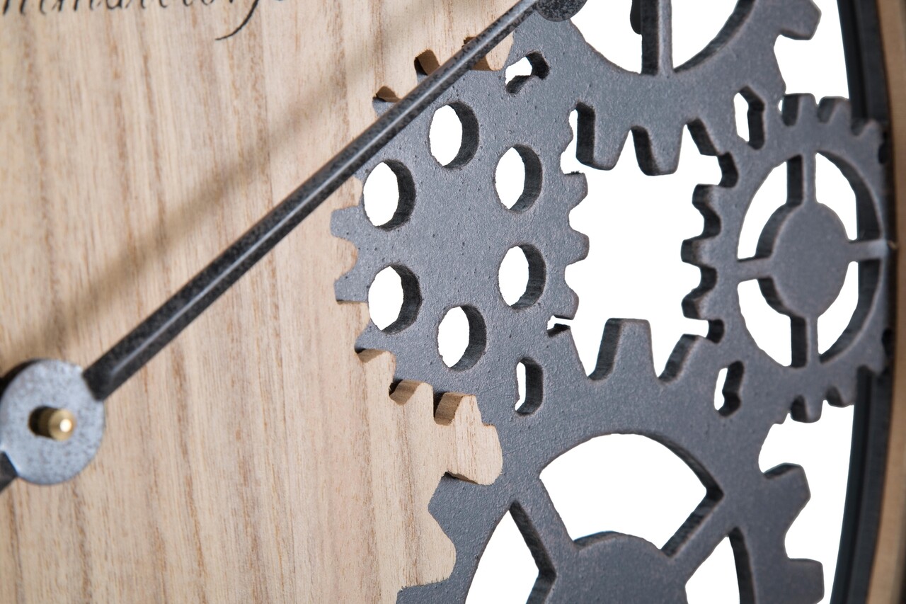 Ceas de perete rotund cu angrenaje care amintesc de mecanismele interne ale dispozitivelor mecanice.