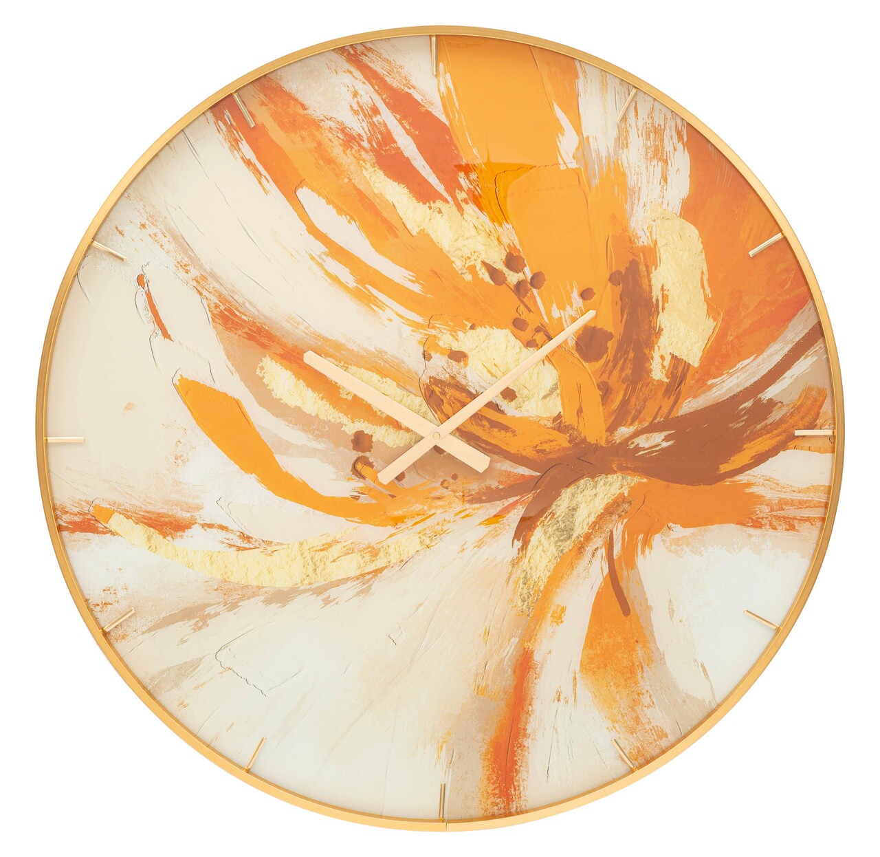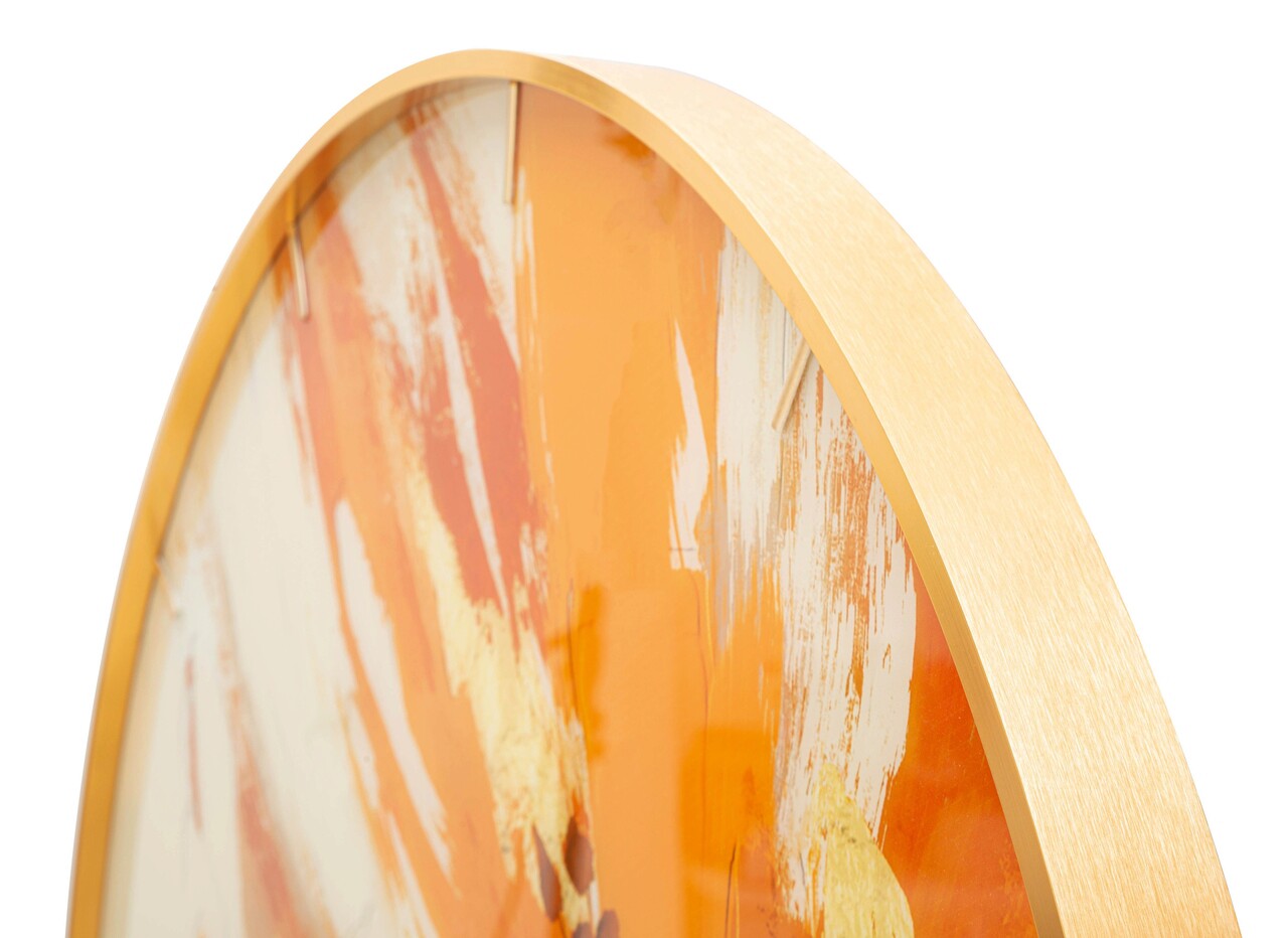 Ceas de perete rotund, cu rama aurie eleganta si cadran decorat in tonuri vii si luminoase. Compozitie material: sticla, MDF, metal. Functioneaza cu baterii AA, neincluse.