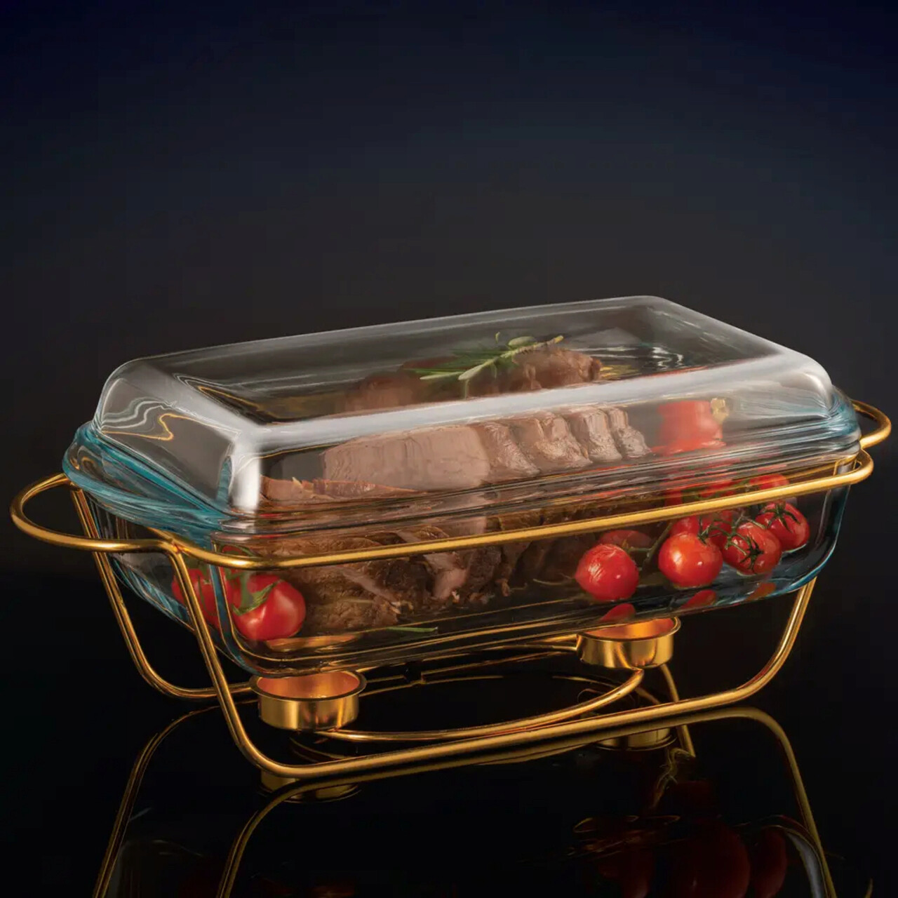 Chafing dish / Vas termorezistent cu incalzitor Saule, Ambition, 3.9 L, sticla, suport auriu