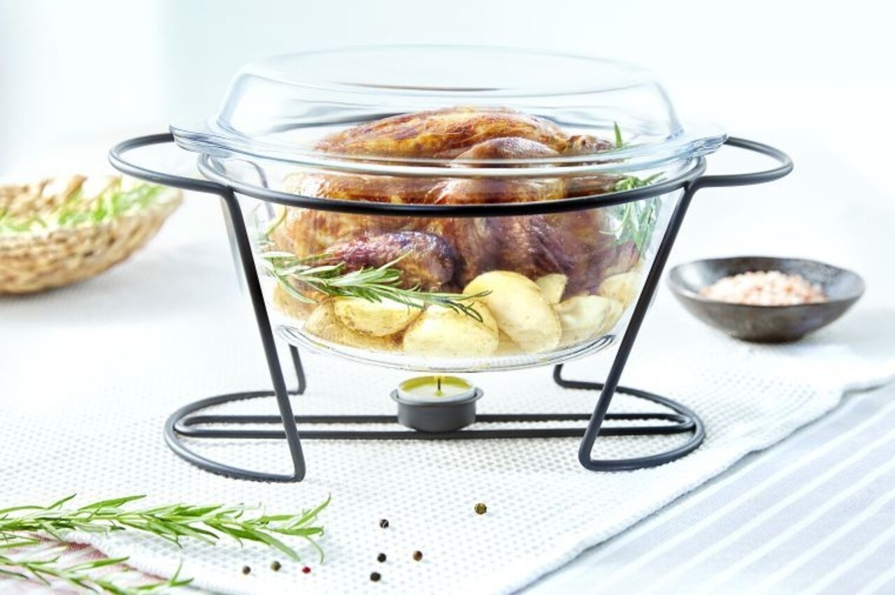 Chafing dish Saule cu vas din sticla termorezistenta. Perfect pentru pastrarea mancarii calde pentru mai multe persoane.