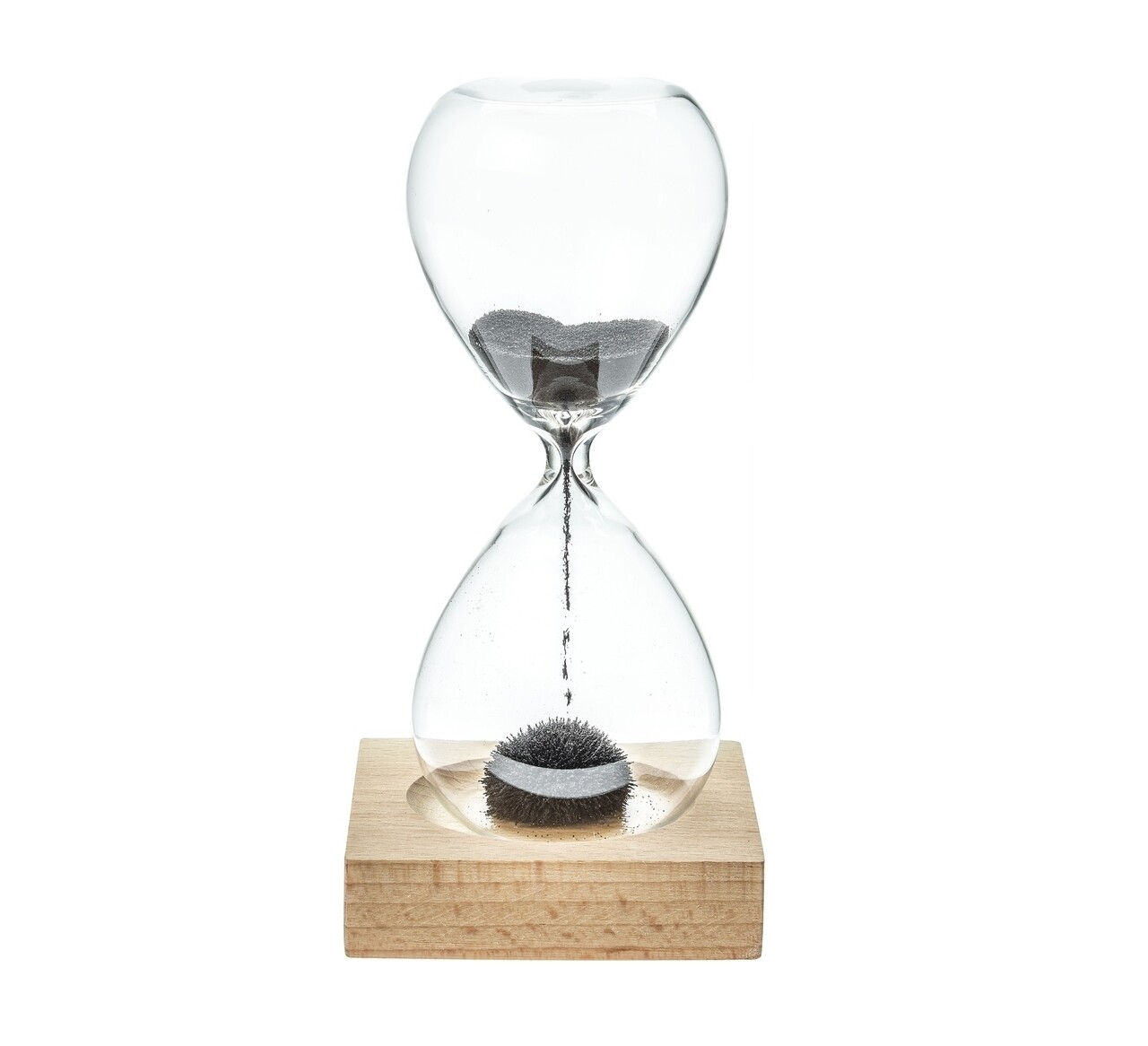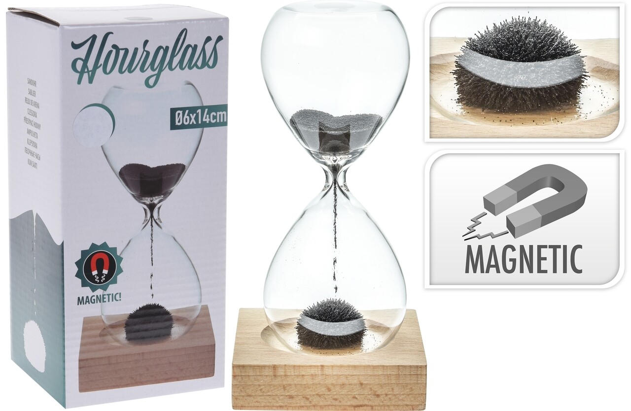 Asezata pe un suport din lemn, clepsidra are un aspect clasic insa este prevazuta cu un nisip magnetic care capata niste forme absolut spectaculoase de fiecare data cand clepsidra este intoarsa.