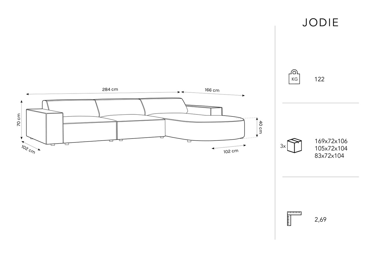 Coltar dreapta 4 locuri, Jodie, Micadoni Home, BL, forma rotunjita, 284x166x70 cm, catifea, gri