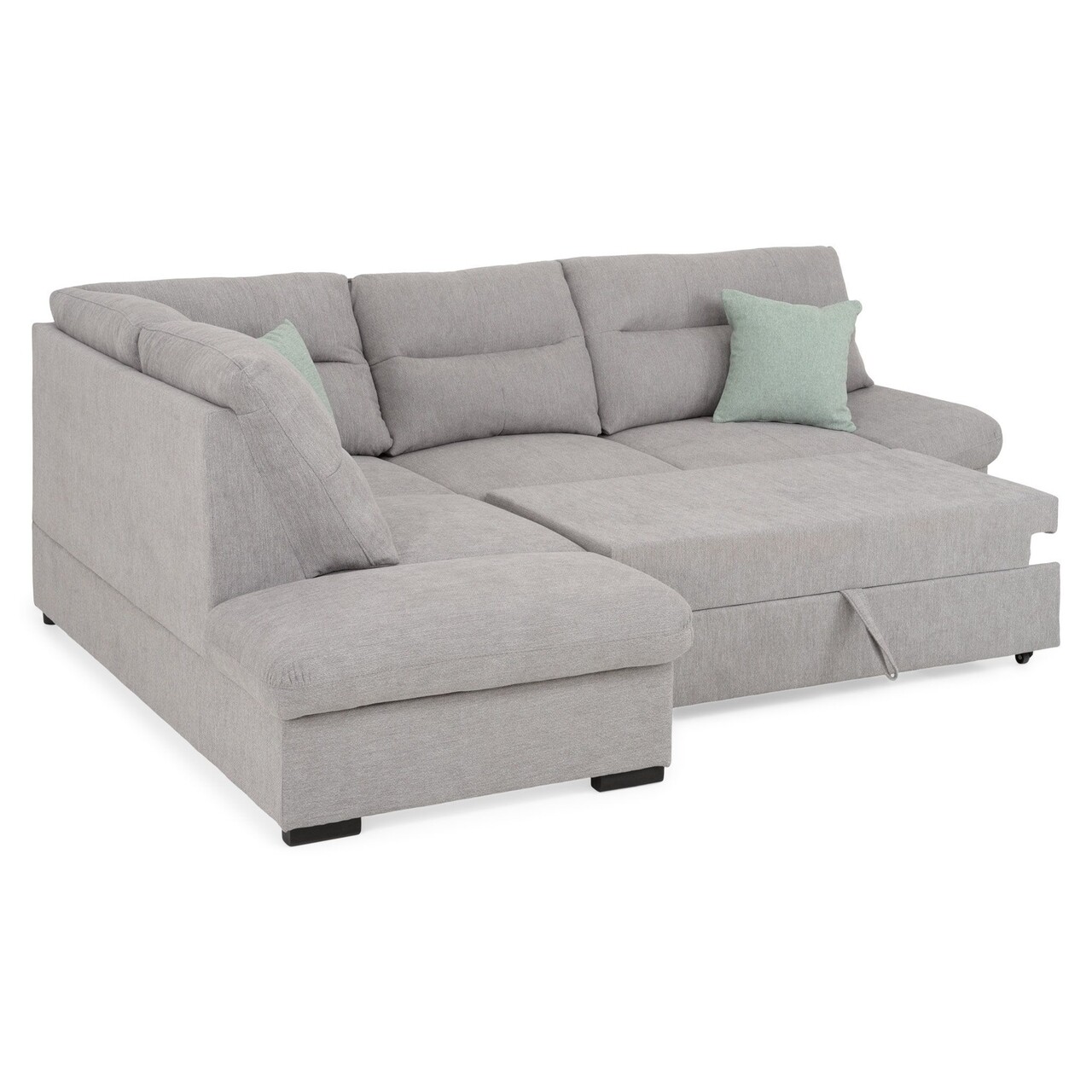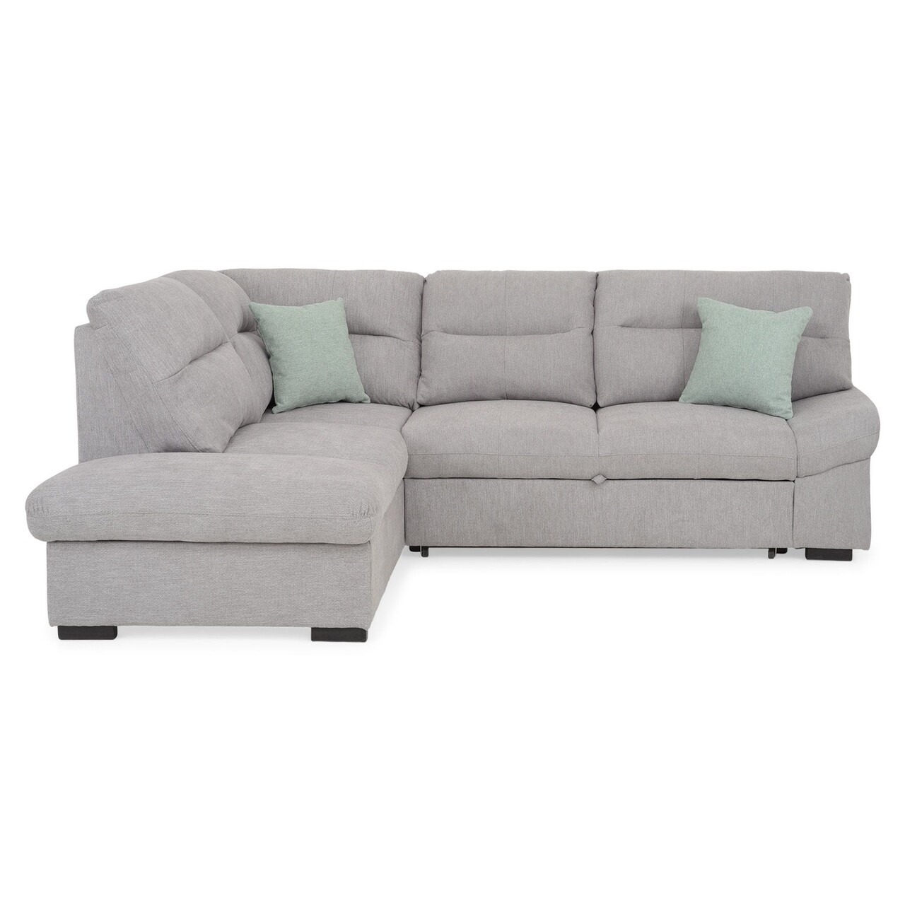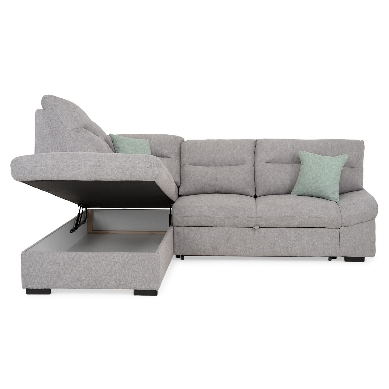 Coltar extensibil cu sezlong stanga + 2 perne decorative albastre, Mabel, L.257 l.196/92 H.93, stofa, gri deschis