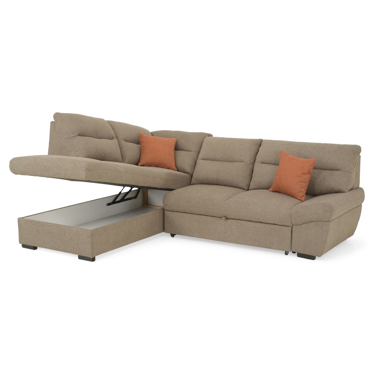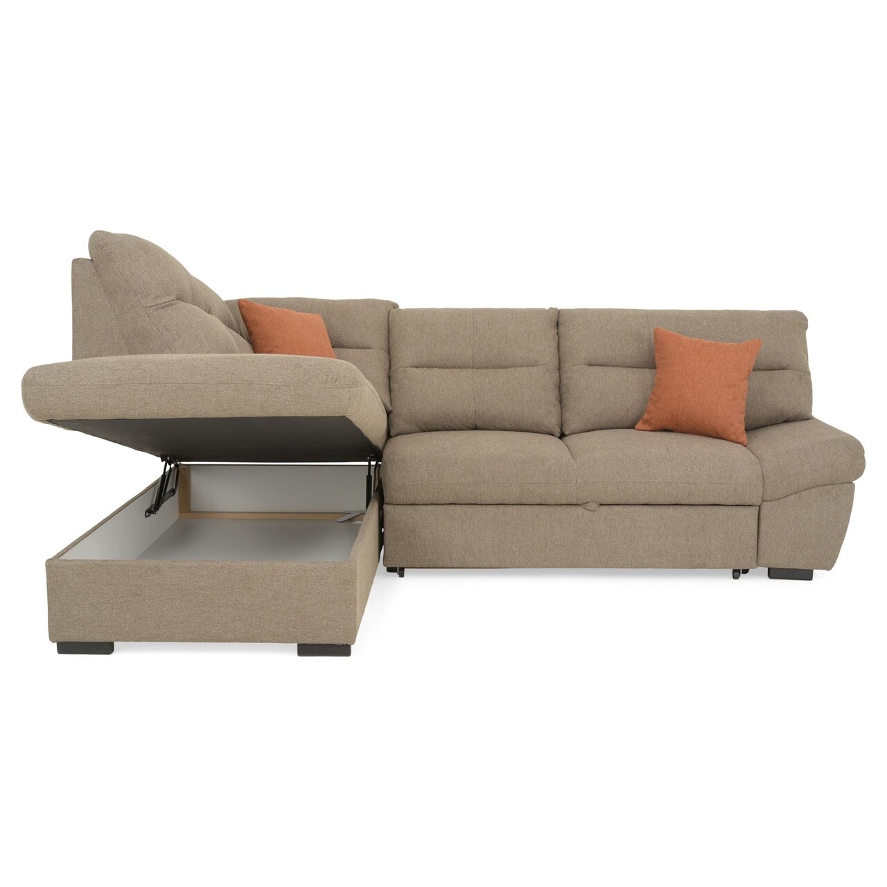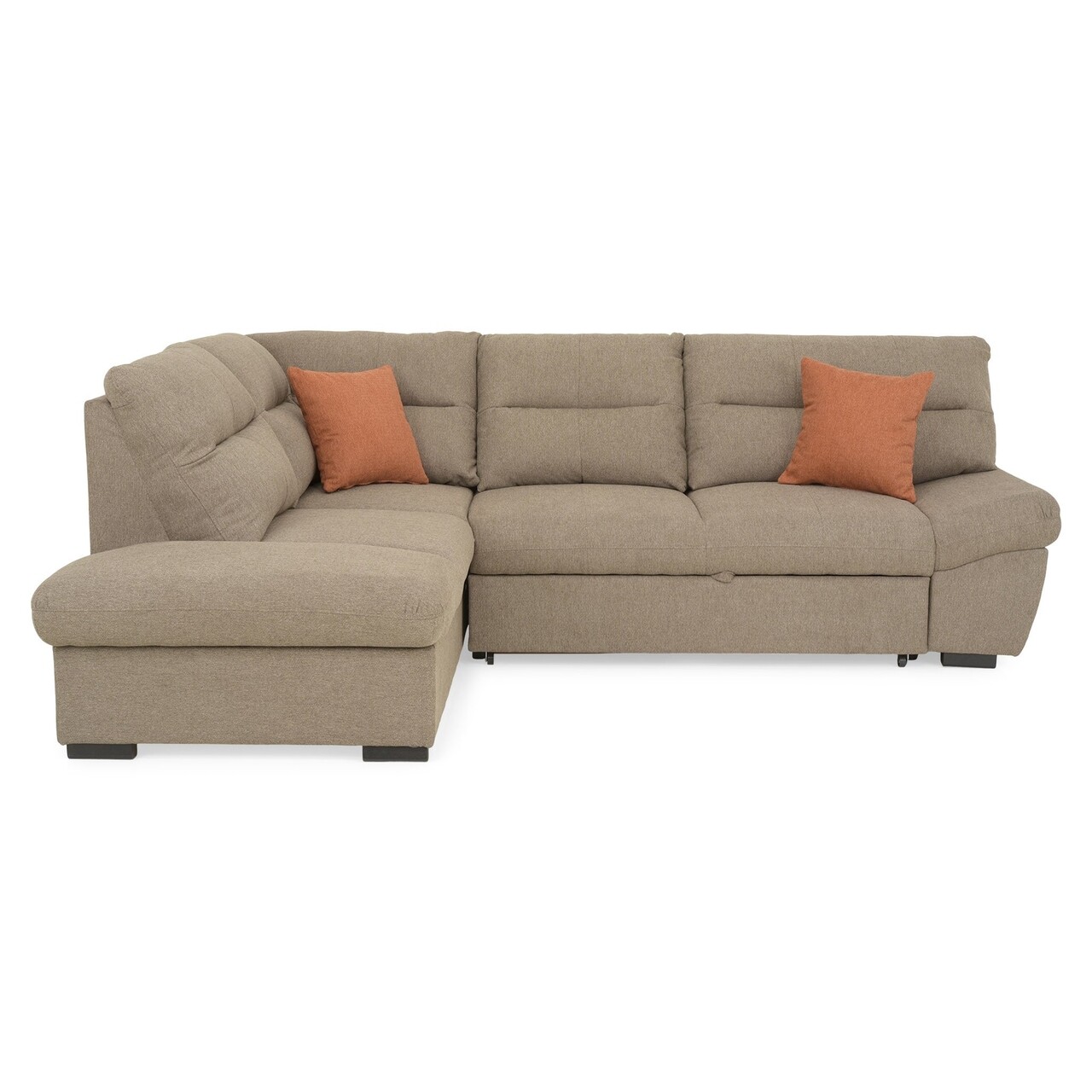 Coltar extensibil cu sezlong stanga + 2 perne decorative portocalii, Mabel, L.257 l.196/92 H.93, stofa, cappuccino