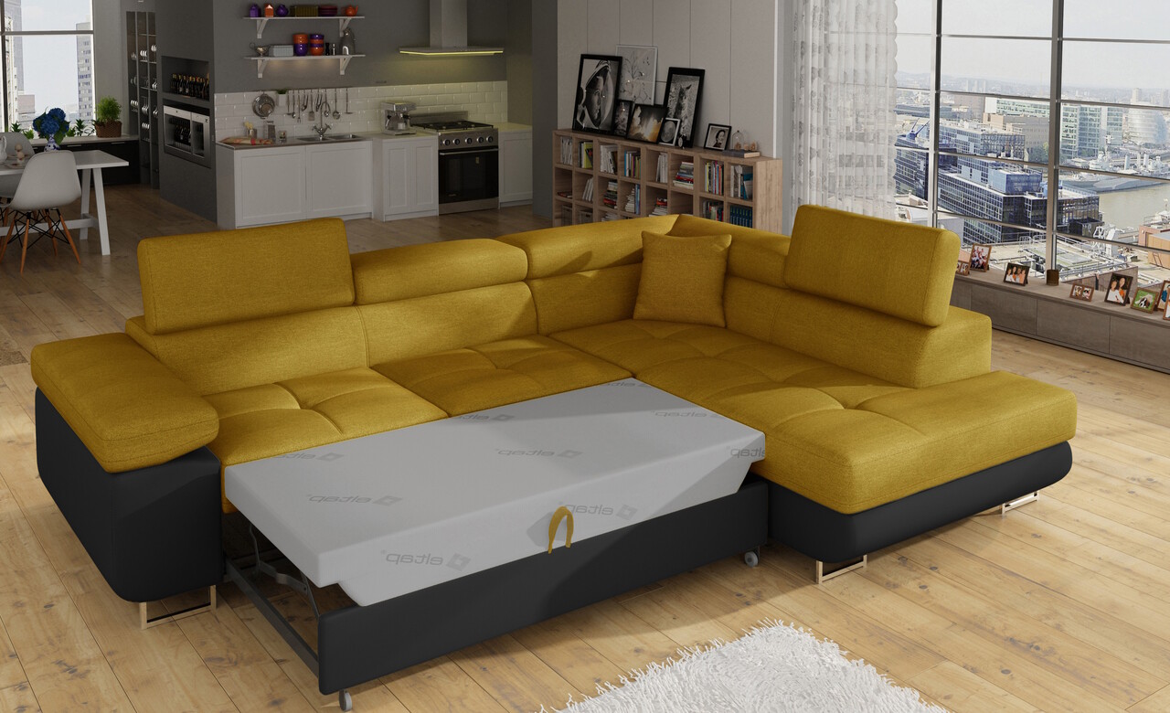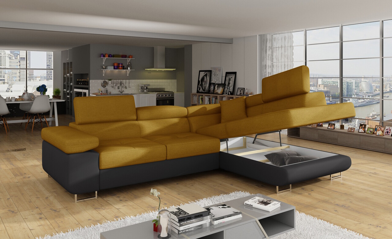 Coltar extensibil dreapta 4 locuri, ELTAP, Anton, 272x203x85 cm, lemn/poliester, mustar/negru