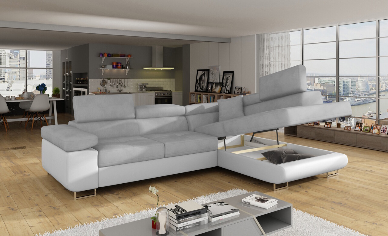 Coltar extensibil dreapta 4 locuri, ELTAP, Anton, 272x203x85 cm, lemn/poliester, gri deschis/alb