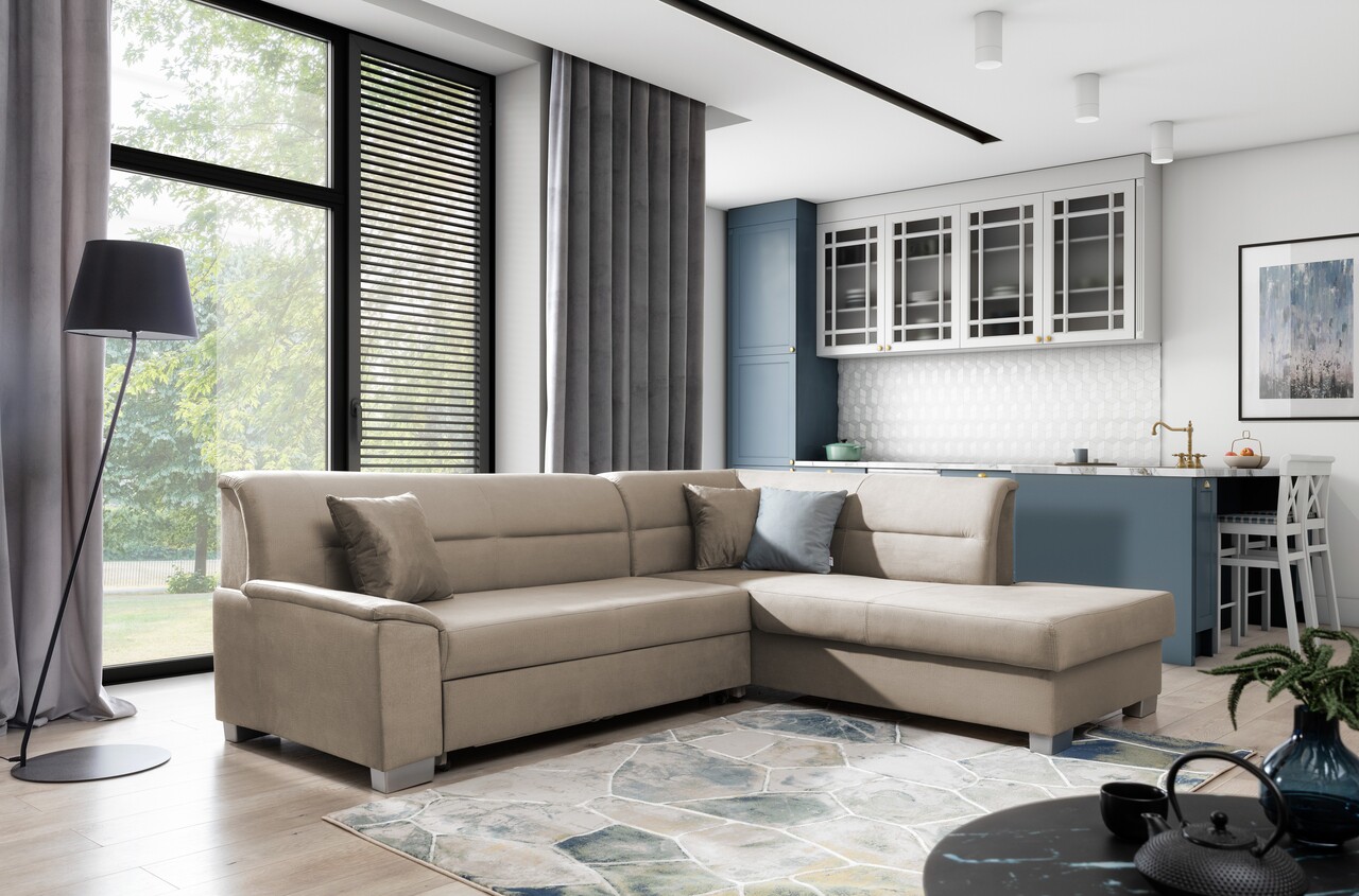 Coltar extensibil dreapta 4 locuri ELTAP, BR35, Bergen, 247x214x83 cm, lemn/poliester, maro deschis