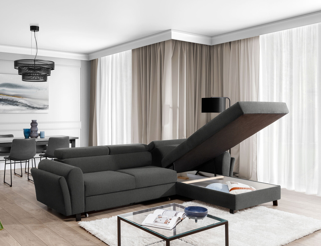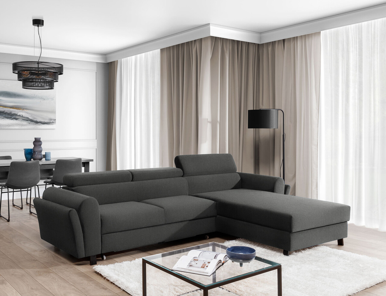 Coltar extensibil dreapta 4 locuri ELTAP, Mari-41, Mariall, 288x200x92 cm, lemn/poliester, gri inchis