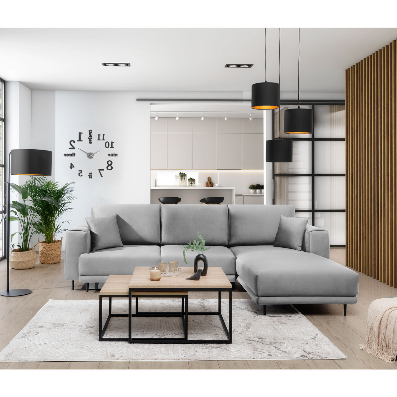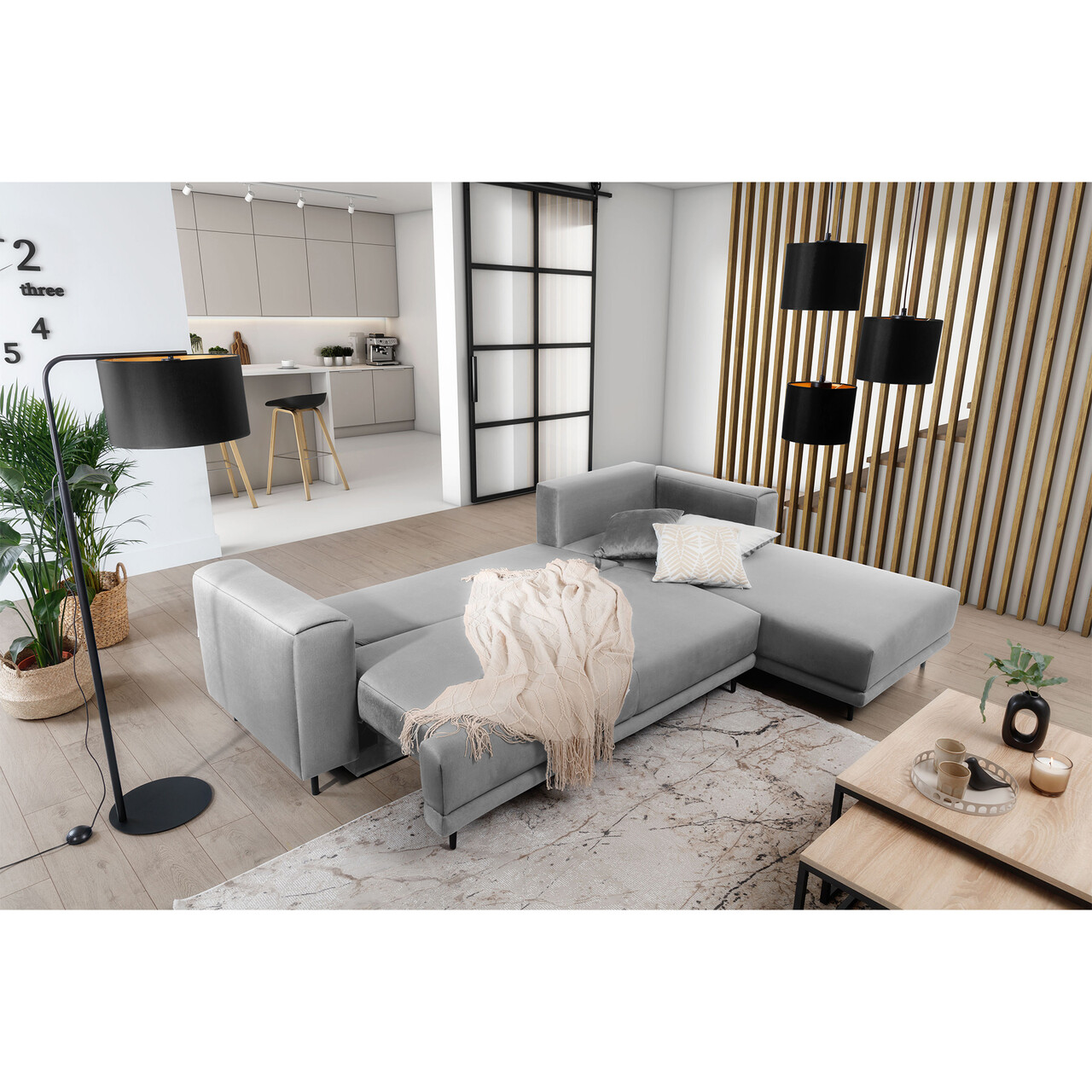 Coltar extensibil dreapta 4 locuri ELTAP, RT-03NU, Dalia, 289x190x95 cm, lemn/poliester, gri deschis