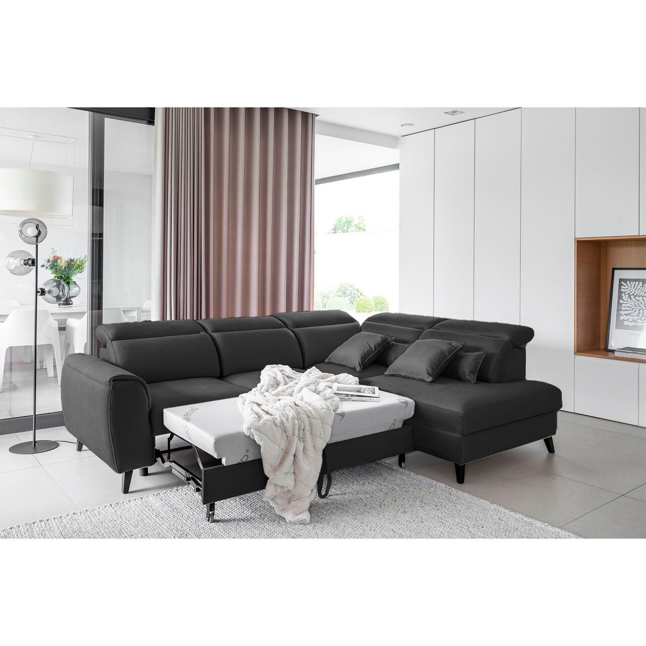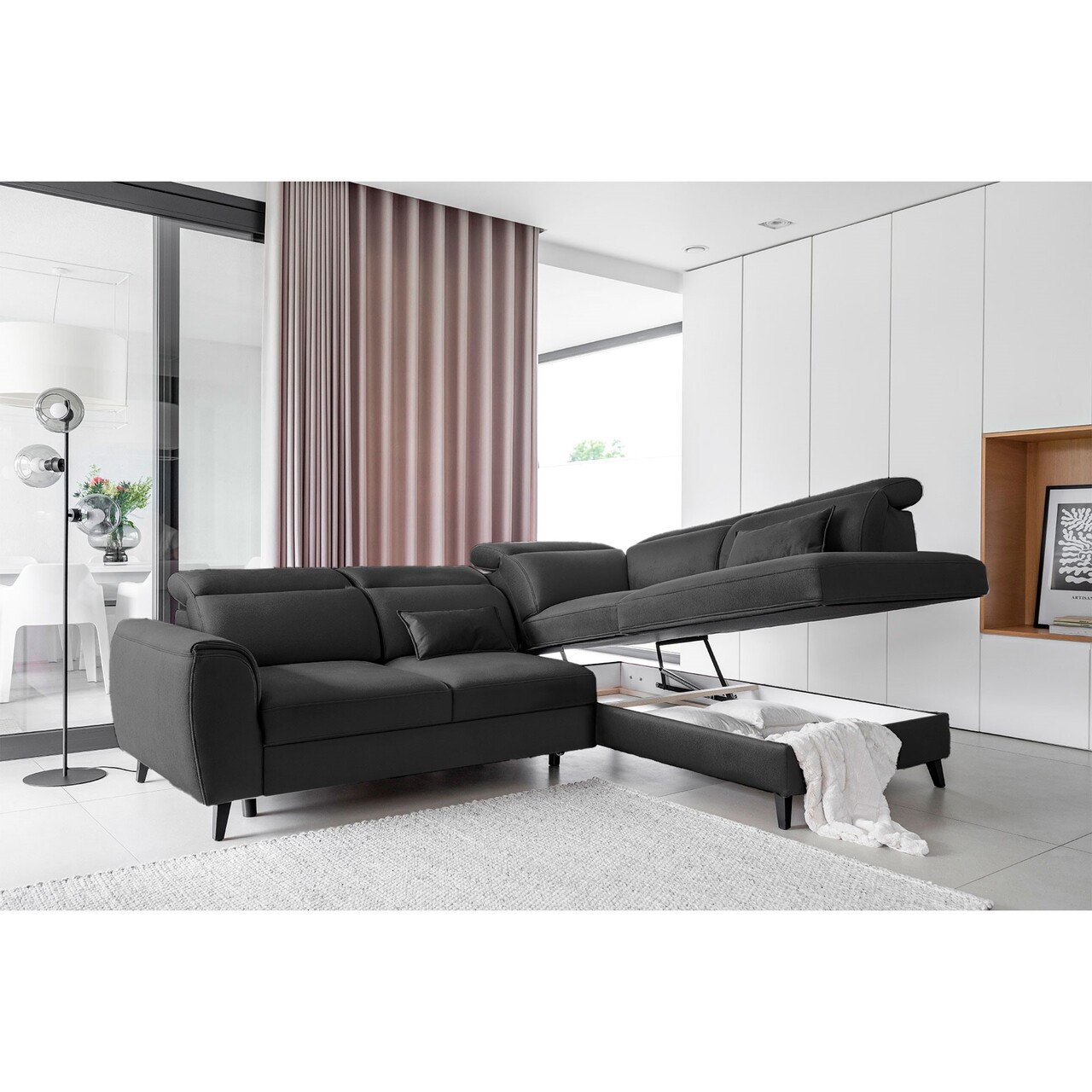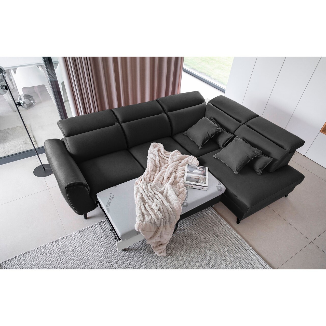 Coltar extensibil dreapta 4 locuri ELTAP, RT-06NU, Noble, 255x201x100 cm, lemn/poliester, gri inchis