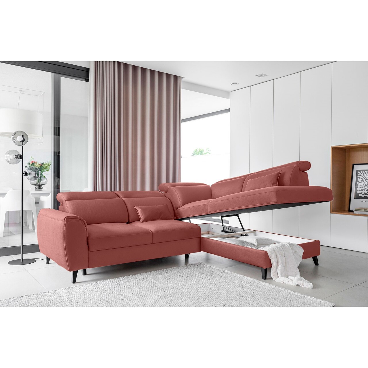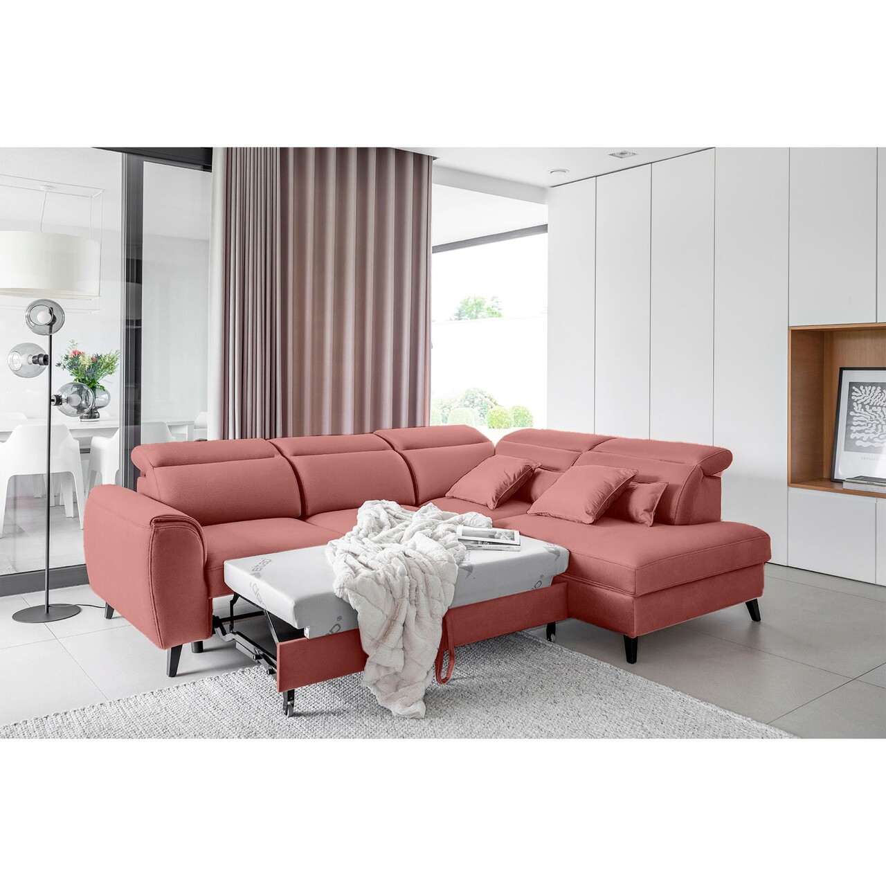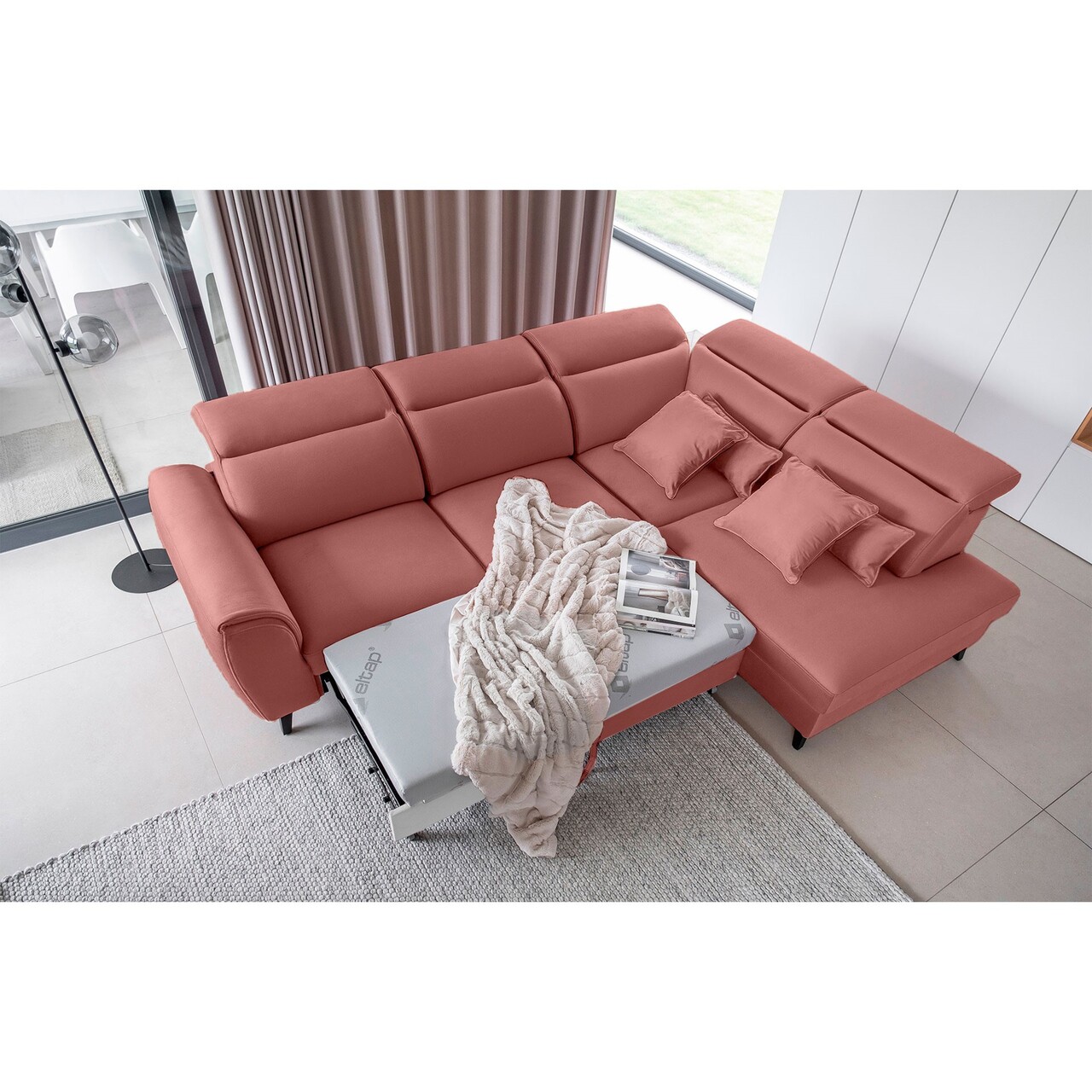 Coltar extensibil dreapta 4 locuri ELTAP, RT-24LU, Noble, 255x201x100 cm, lemn/poliester, roz inchis