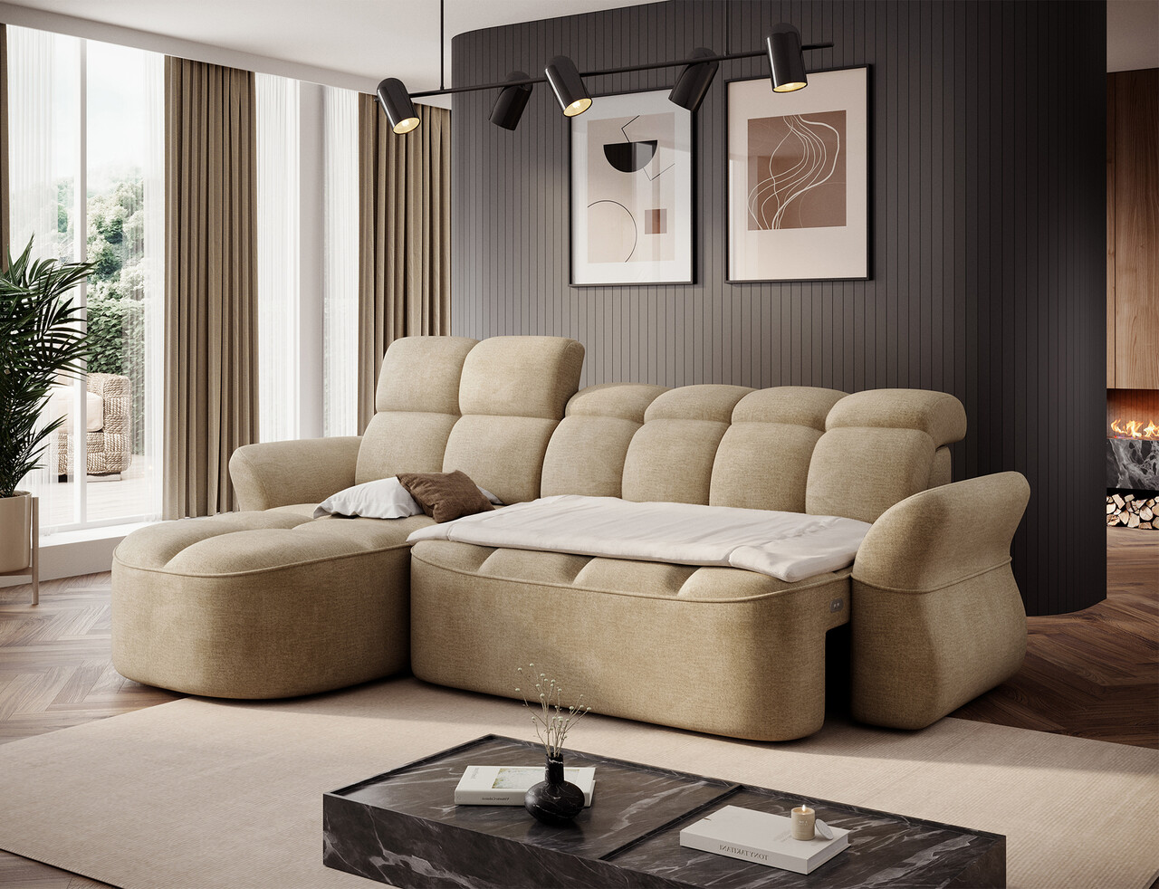 Coltar extensibil stanga 3 locuri ELTAP, Beneth, 301x185x115 cm, lemn/poliester, bej inchis