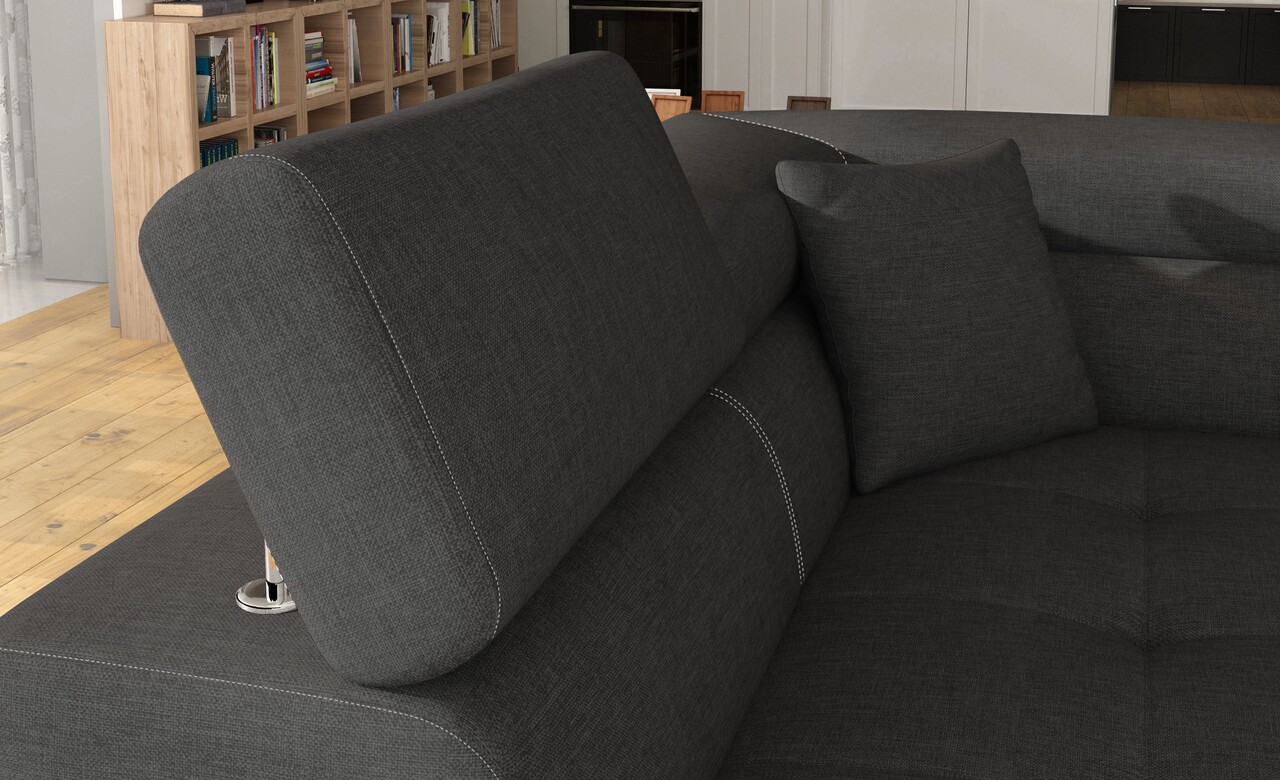 Pentru un confort maxim, coltarul Anton este dotat cu tetiere inalte si reglabile, brate late de 28 cm si picioare metalice elegante, cu o inaltime de 9 cm, asigurand astfel un design modern si stabilitate optima.