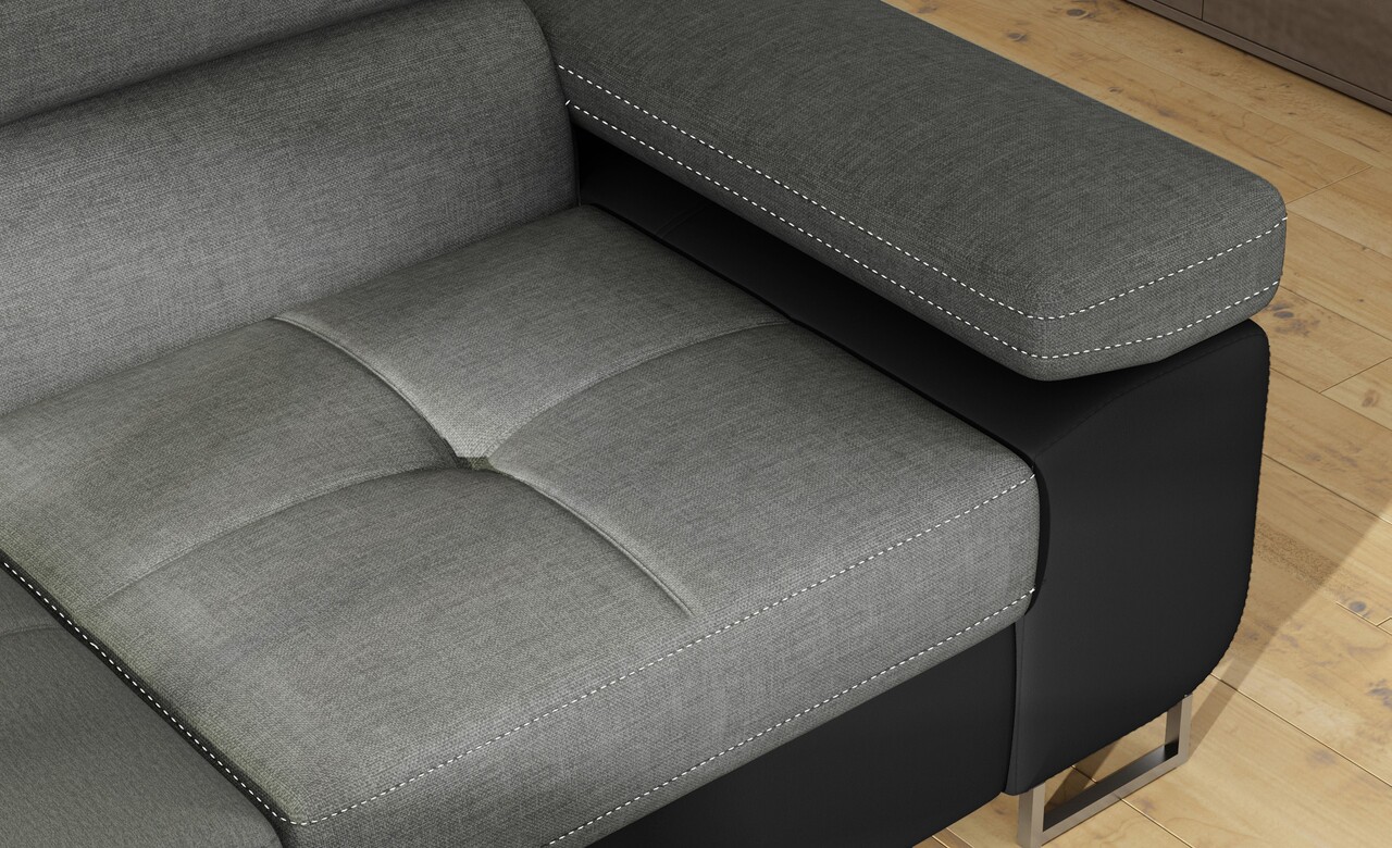 Pentru un confort maxim, coltarul Anton este dotat cu tetiere inalte si reglabile, brate late de 28 cm si picioare metalice elegante, cu o inaltime de 9 cm, asigurand astfel un design modern si stabilitate optima.