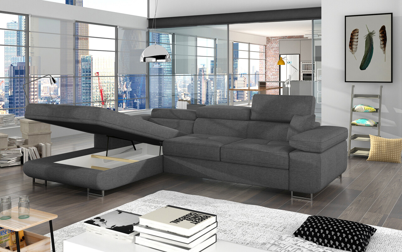 Armando este un coltar elegant si functional. Confortul ridicat al odihnei este sporit de cotierele largi, spatarul bine conturat si tetierele inalte reglabile. Sezutul spatiosului coltar este realizat din spuma T30 care garanteaza confort si rezistenta maxima. Coltarul in forma de L este echipat cu o functie de dormit si are o lada de depozitare spatioasa pentru asternuturi. Cu matlasare delicata, cusaturi elegante si picioare inalte, cromate, coltarul Armando se mentine intr-un stil modern de finisare. Este disponibil in mai multe versiuni de culoare. Merita sa aveti o astfel de piesa de mobilier in locuinta dumneavoastra.