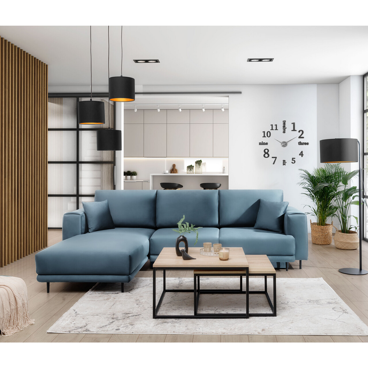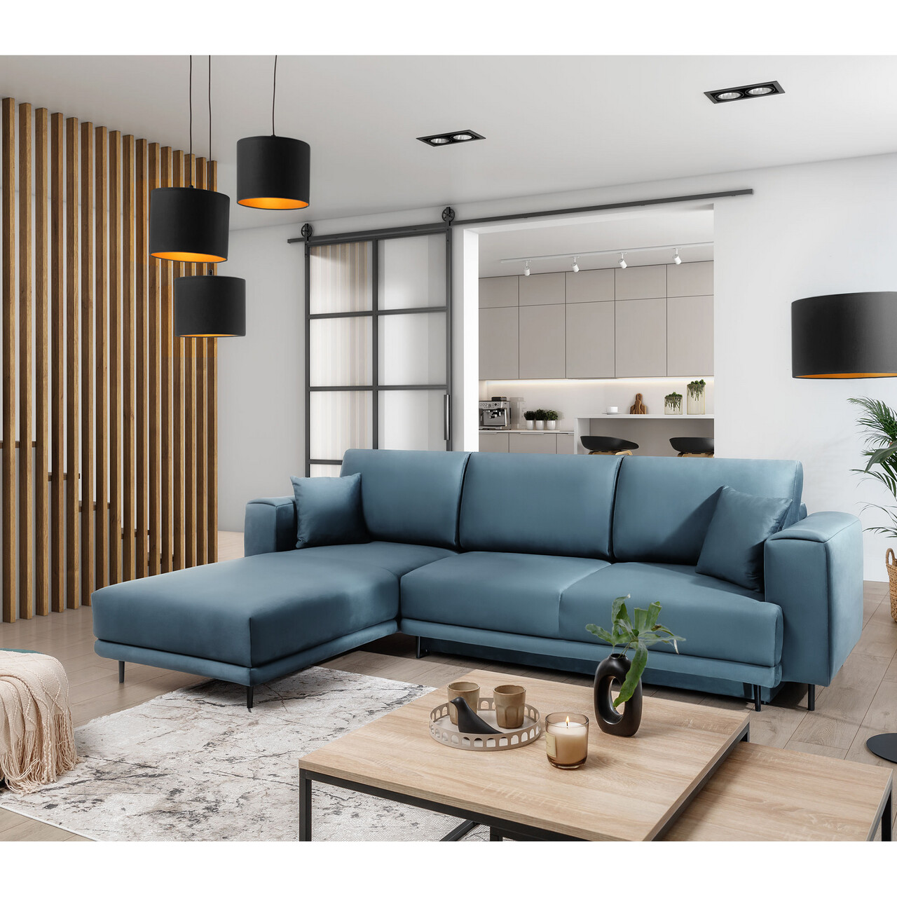 Coltar extensibil stanga 4 locuri ELTAP, LT-100VE, Dalia, 289x190x95 cm, lemn/poliester, albastru deschis