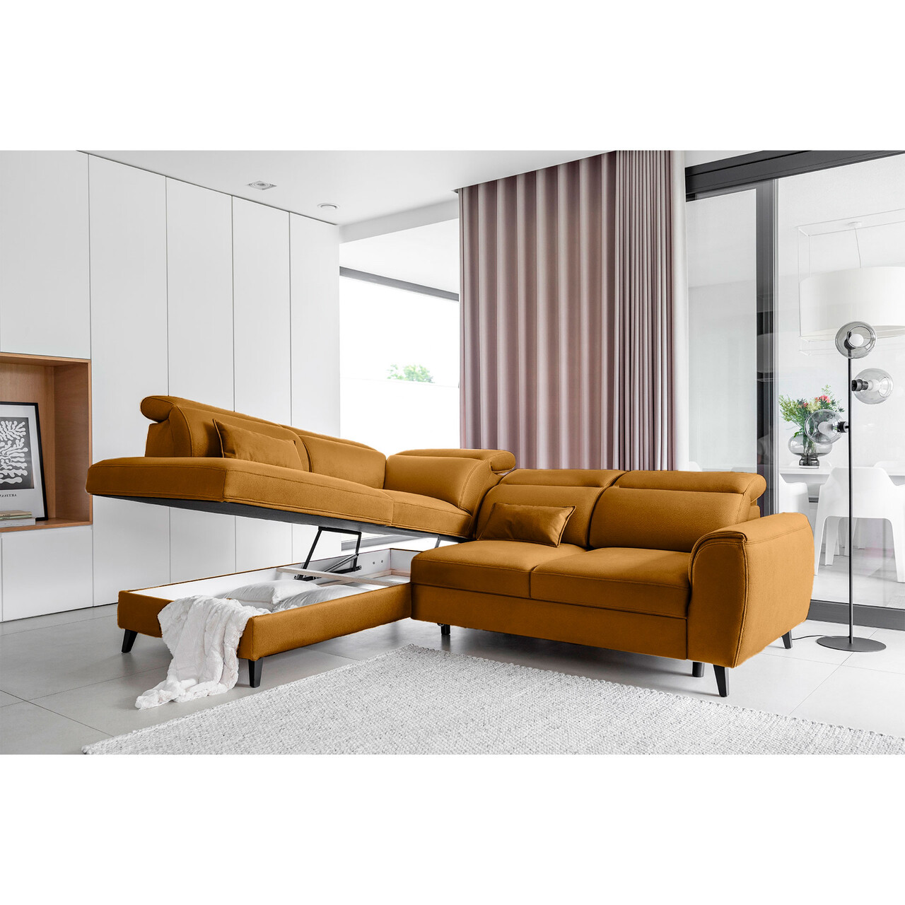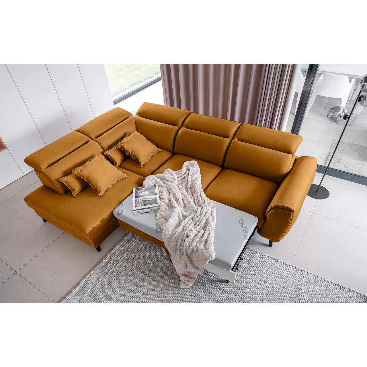 Coltar extensibil stanga 4 locuri ELTAP, LT-45NU, Noble, 255x201x100 cm, lemn/poliester, mustar
