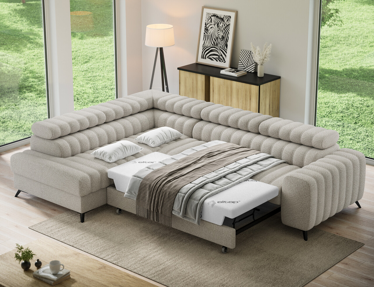 Coltar extensibil stanga 5 locuri ELTAP, LT-18ROY, Kanedo, 269x204x86 cm, lemn/poliester, bej inchis