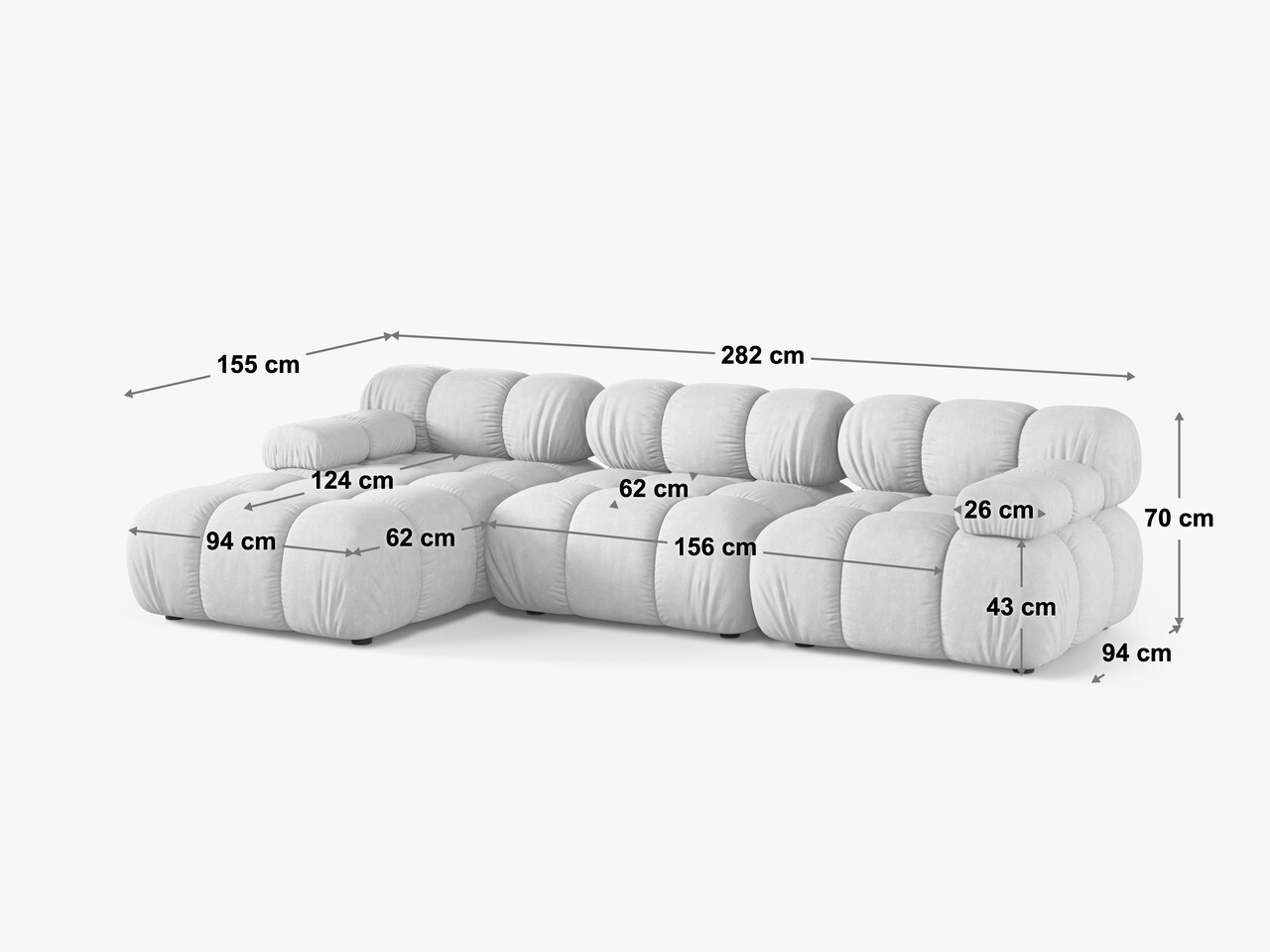 Dimensiunile prezentate se refera la configurarea canapelei de colt. Nu ezitati sa reconfigurati dispunerea modulelor prezentate in imagine in functie de preferintele dvs. Combinati-le, separati-le si deplasati-le pentru a le armoniza cu estetica spatiului dvs. de locuit. Datorita suprafetei sale caracteristice, tesatura de catifea poate avea un aspect diferit in functie de unghiul de lumina. Acest efect este caracteristic pentru un astfel de material textil. Atunci cand rearanjati elementele modulare ale canapelei, nuanta materialului de catifea poate crea diferente subtile in aspectul modulelor.