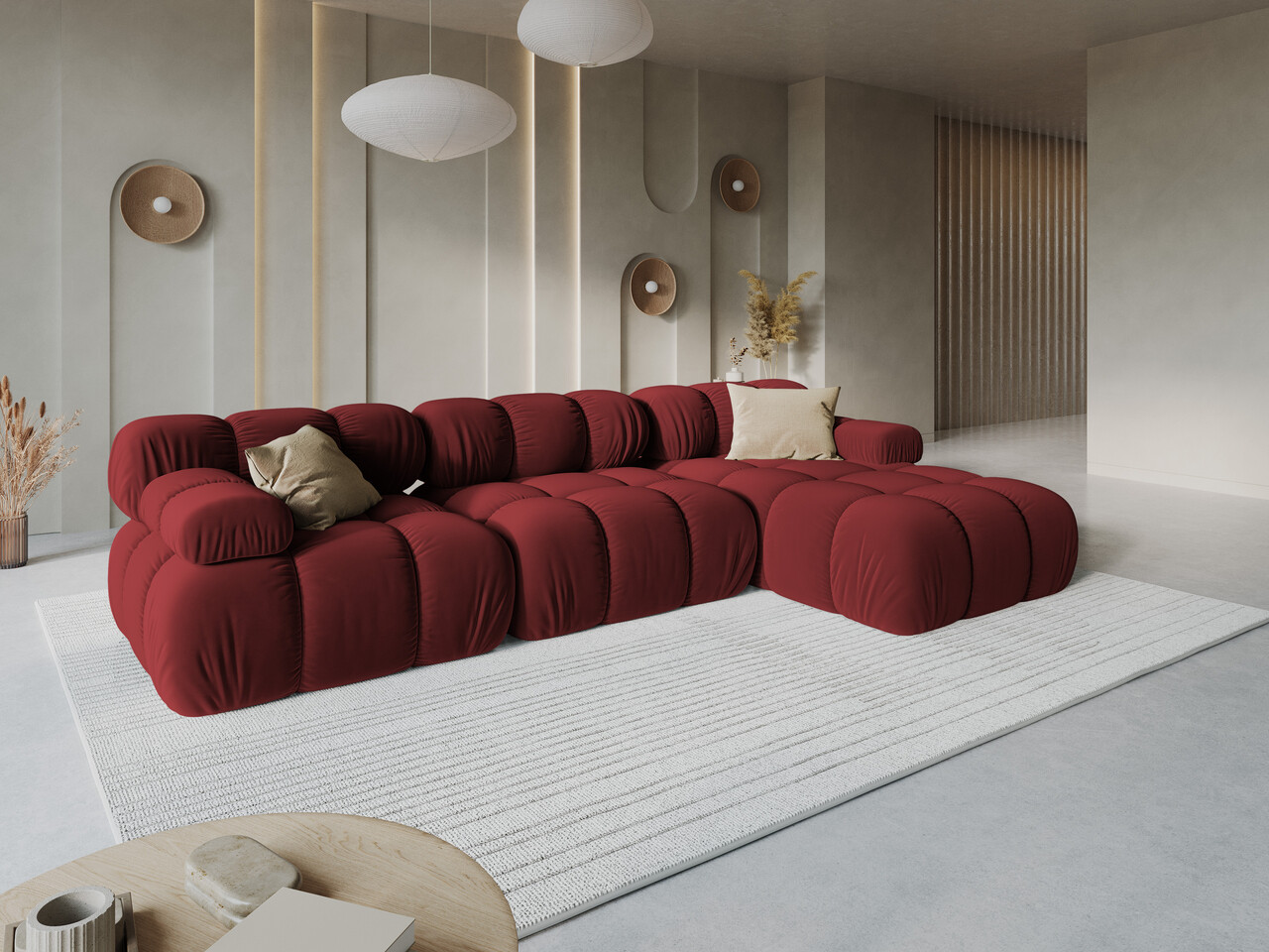 Dimensiunile prezentate se refera la configurarea canapelei de colt. Nu ezitati sa reconfigurati dispunerea modulelor prezentate in imagine in functie de preferintele dvs. Combinati-le, separati-le si deplasati-le pentru a le armoniza cu estetica spatiului dvs. de locuit. Datorita suprafetei sale caracteristice, tesatura de catifea poate avea un aspect diferit in functie de unghiul de lumina. Acest efect este caracteristic pentru un astfel de material textil. Atunci cand rearanjati elementele modulare ale canapelei, nuanta materialului de catifea poate crea diferente subtile in aspectul modulelor.