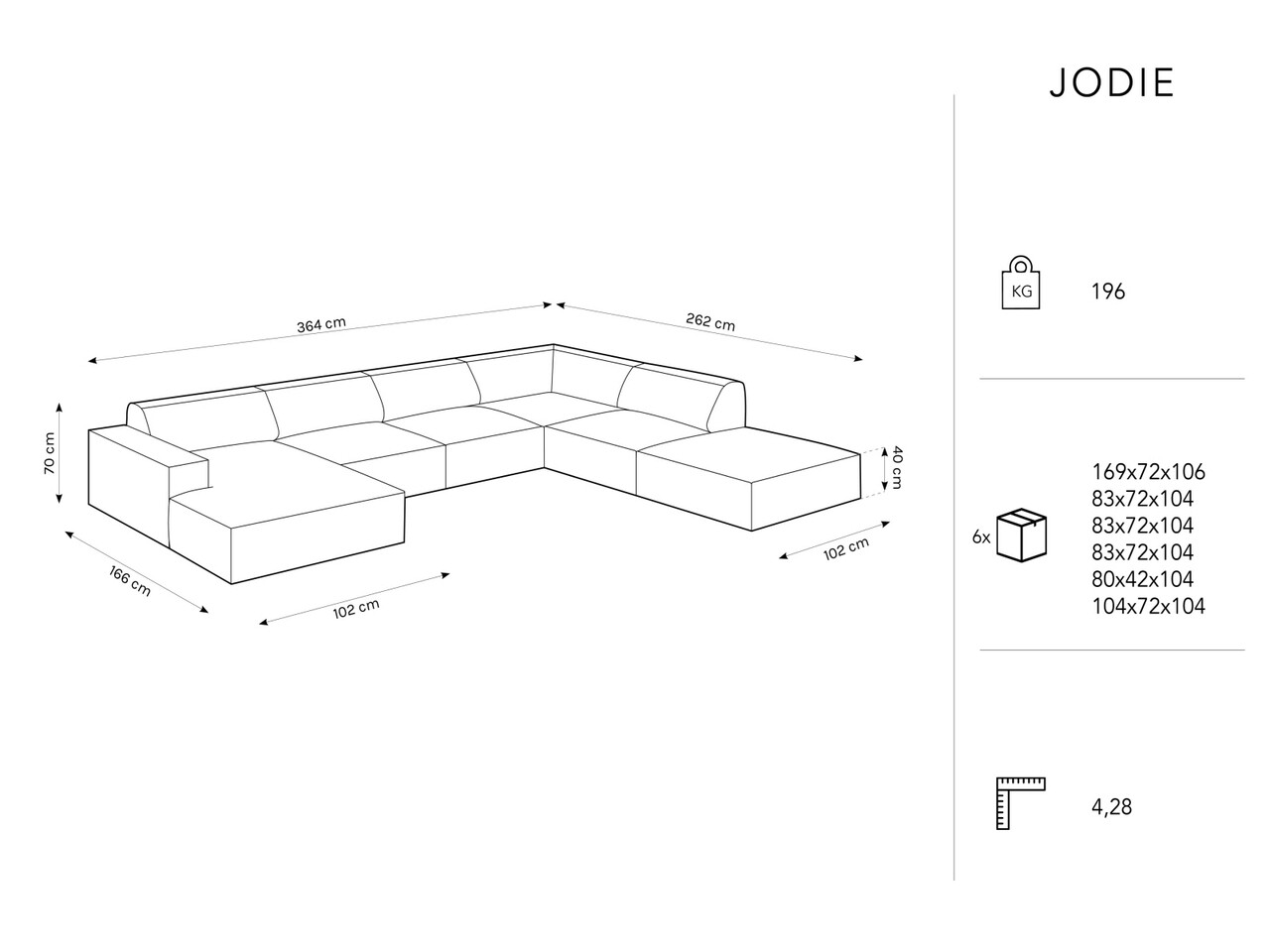 Coltar panoramic dreapta 7 locuri, Jodie, Micadoni Home, BL, 364x262x70 cm, poliester, negru