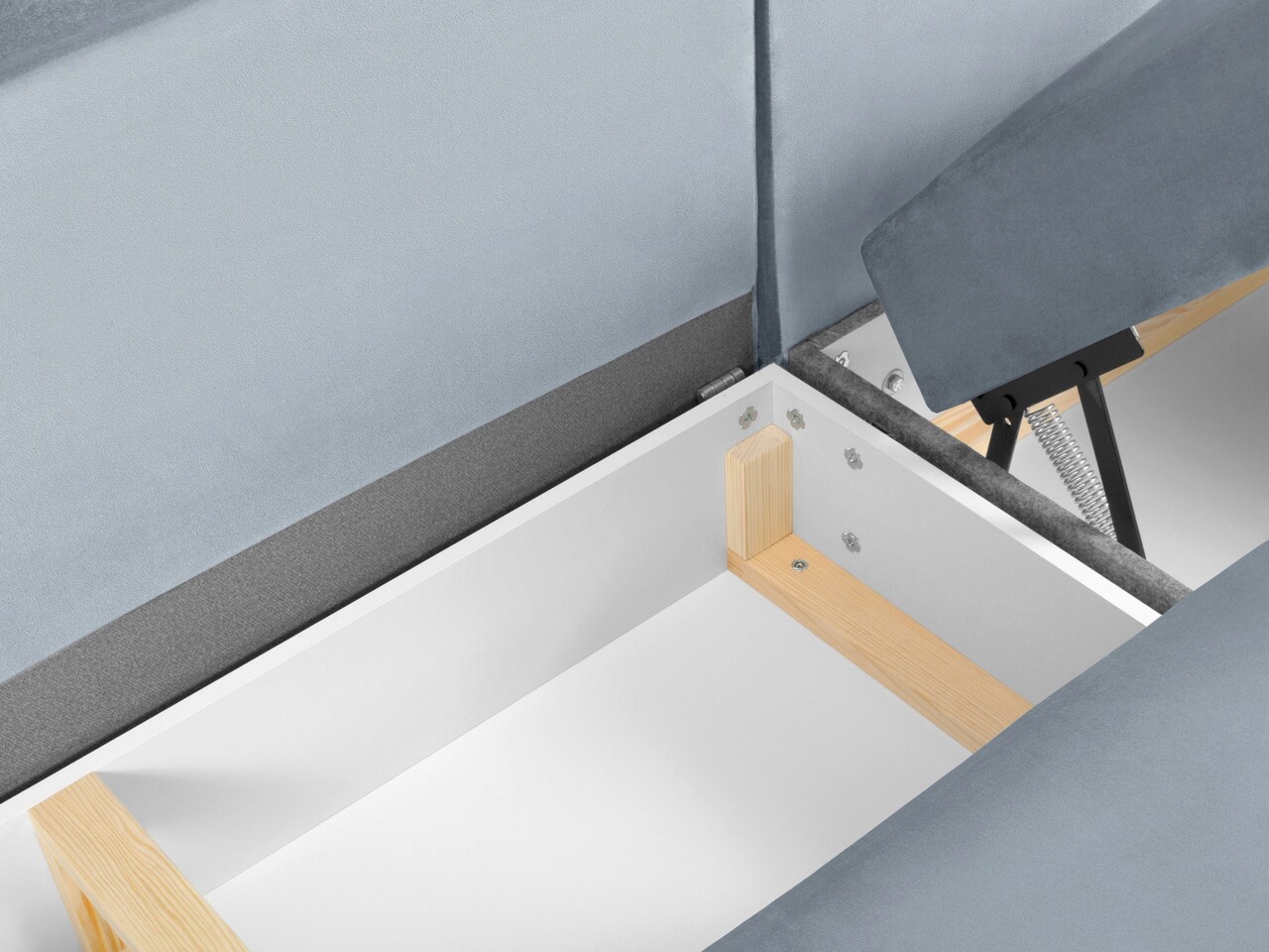 Material structura: cadru din lemn masiv de pin, PAL, placi din fibra, placaj, arcuri, picioare din metal cromat negru.