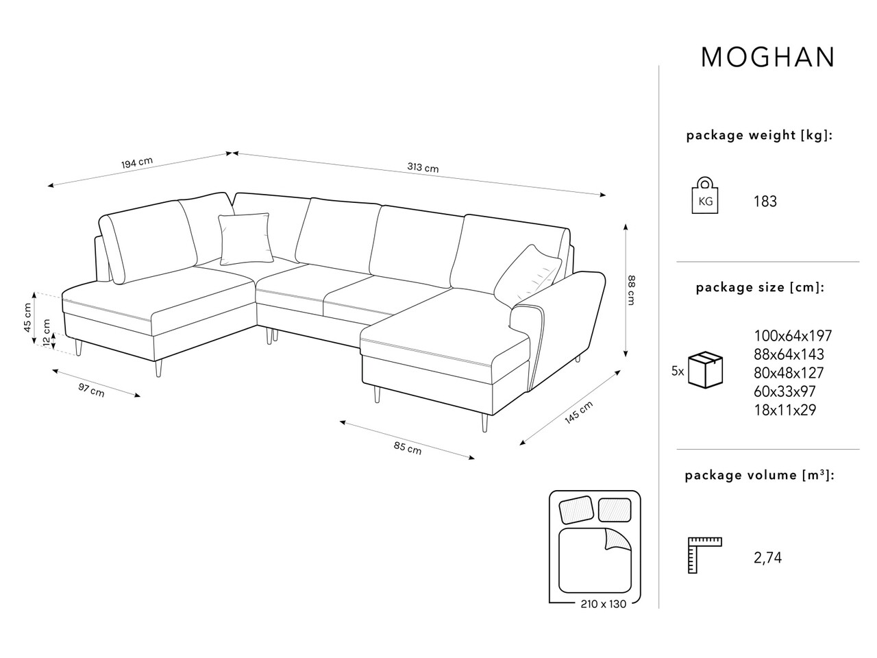 Coltar panoramic extensibil stanga 7 locuri, Moghan, Micadoni Home, BL, 313x194x88 cm, catifea, albastru petrol