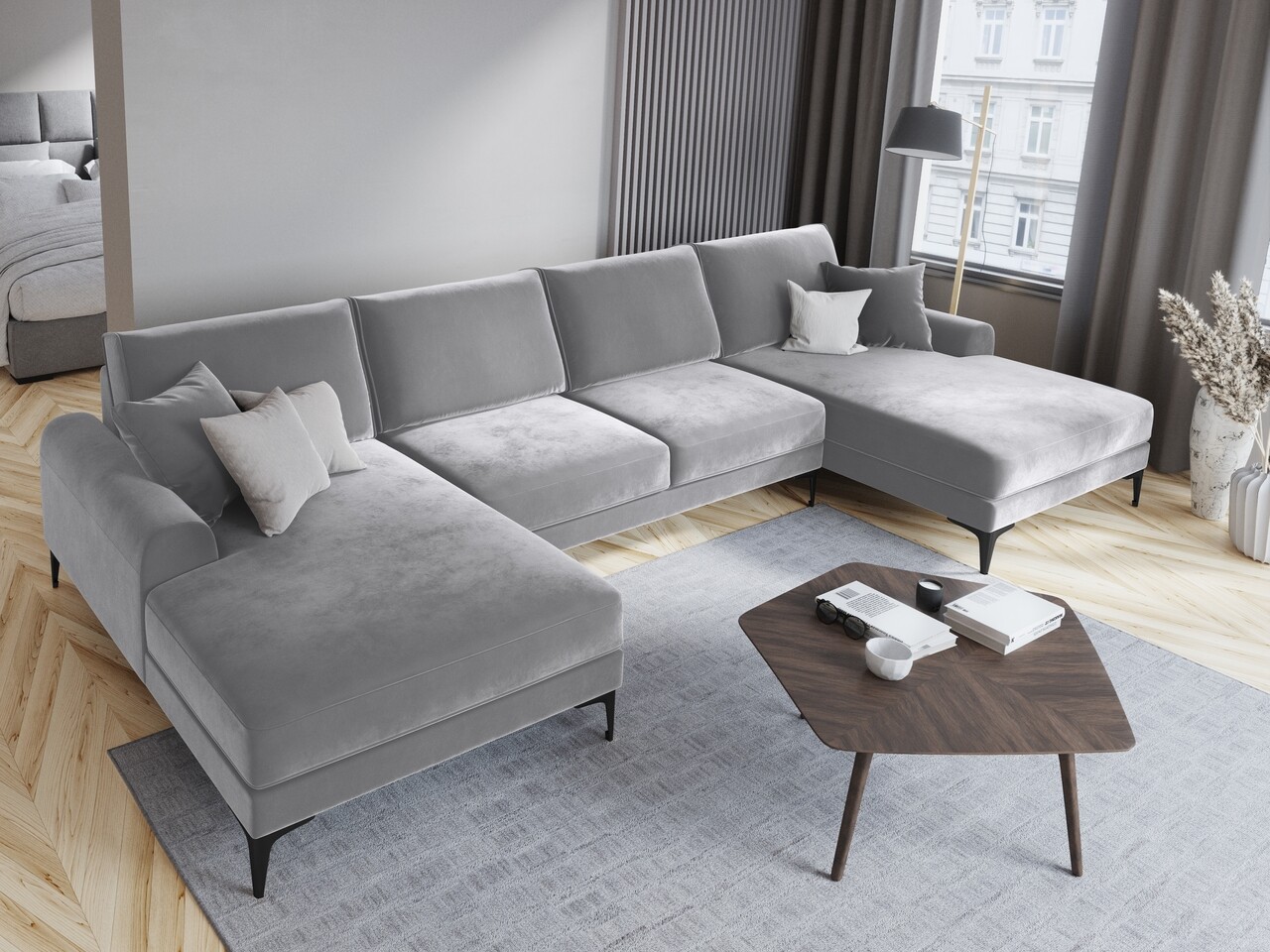 Coltar panoramic, Madara, Mazzini Sofas, 6 locuri, 334x182x90 cm, catifea, argintiu