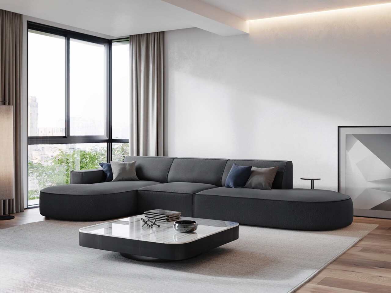 Coltar stanga 4 locuri, Jodie, Micadoni Home, BL, forma rotunjita, 342x166x70 cm, poliester, gri inchis