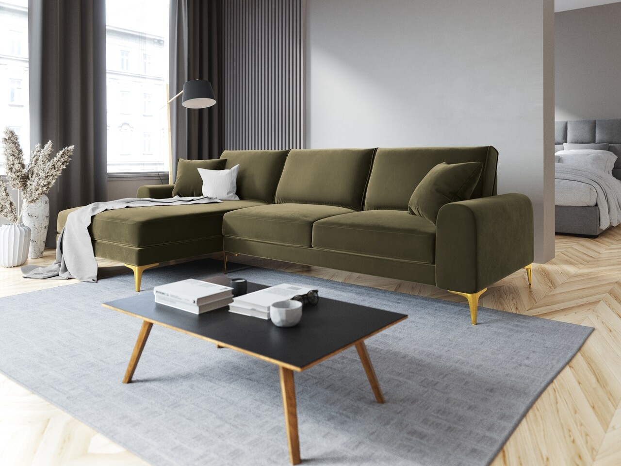 Coltar stanga, Madara, Mazzini Sofas, 5 locuri, gold legs, 254x182x90 cm, catifea, verde