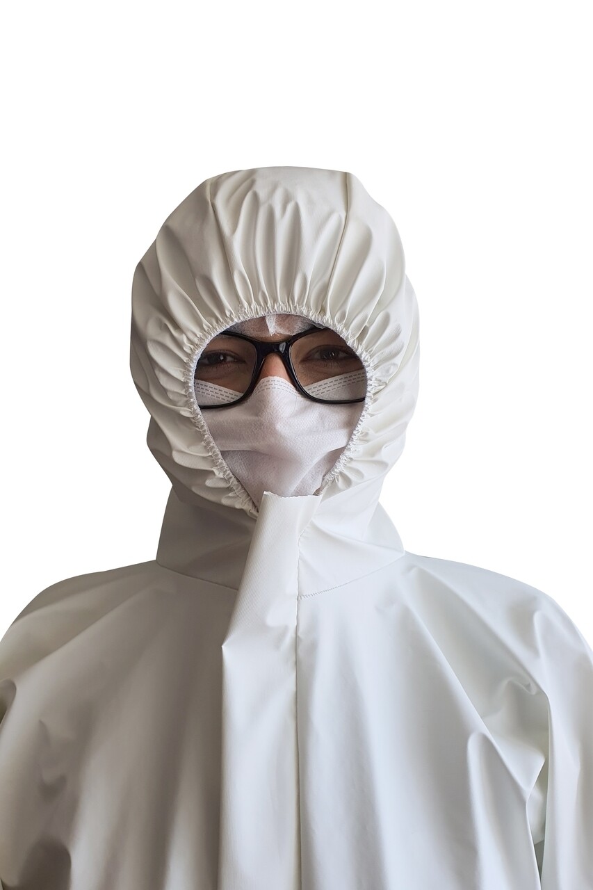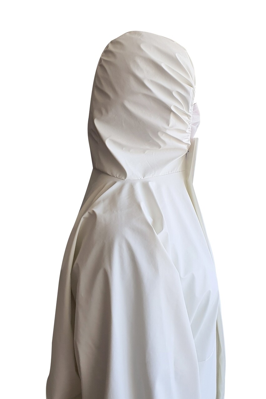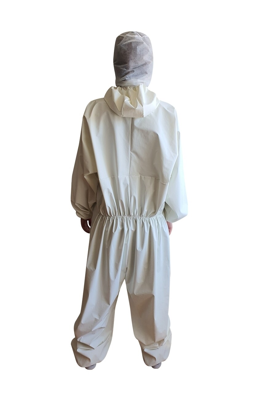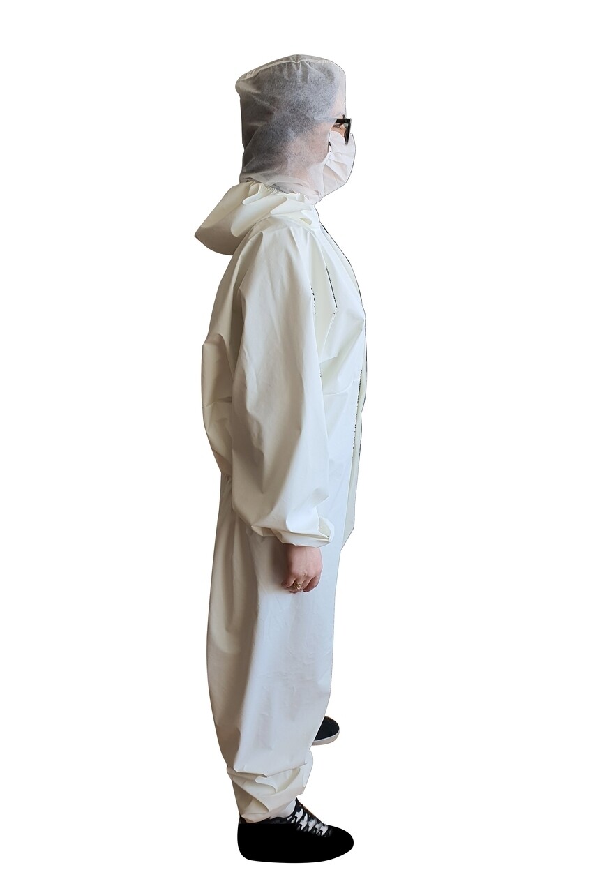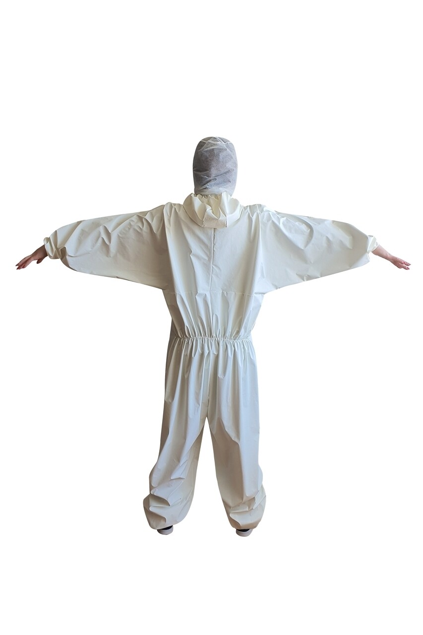 Combinezon impermeabil realizat din textil netesut de polipropilena pe care este aplicat un film respirabil din polietilena.