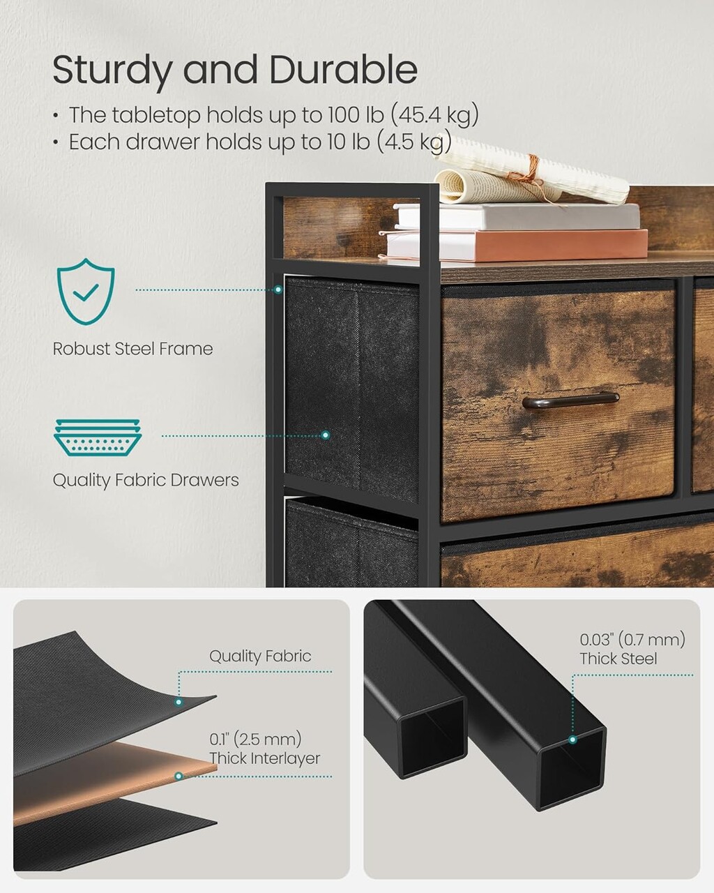 Comoda cu 5 sertare textile, Songmics, 98.2x29x70 cm, otel/MDF/poliester, maro rustic