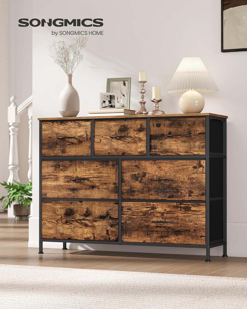 Comoda cu 7 sertare, Songmics, otel, 98.8x30x73.7 cm, maro rustic/negru