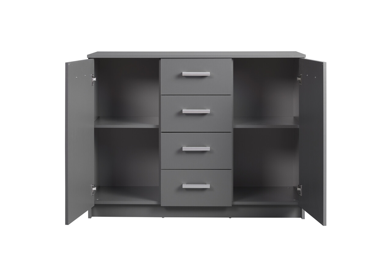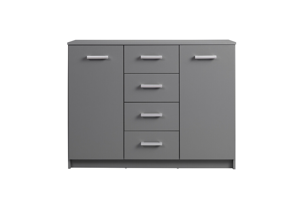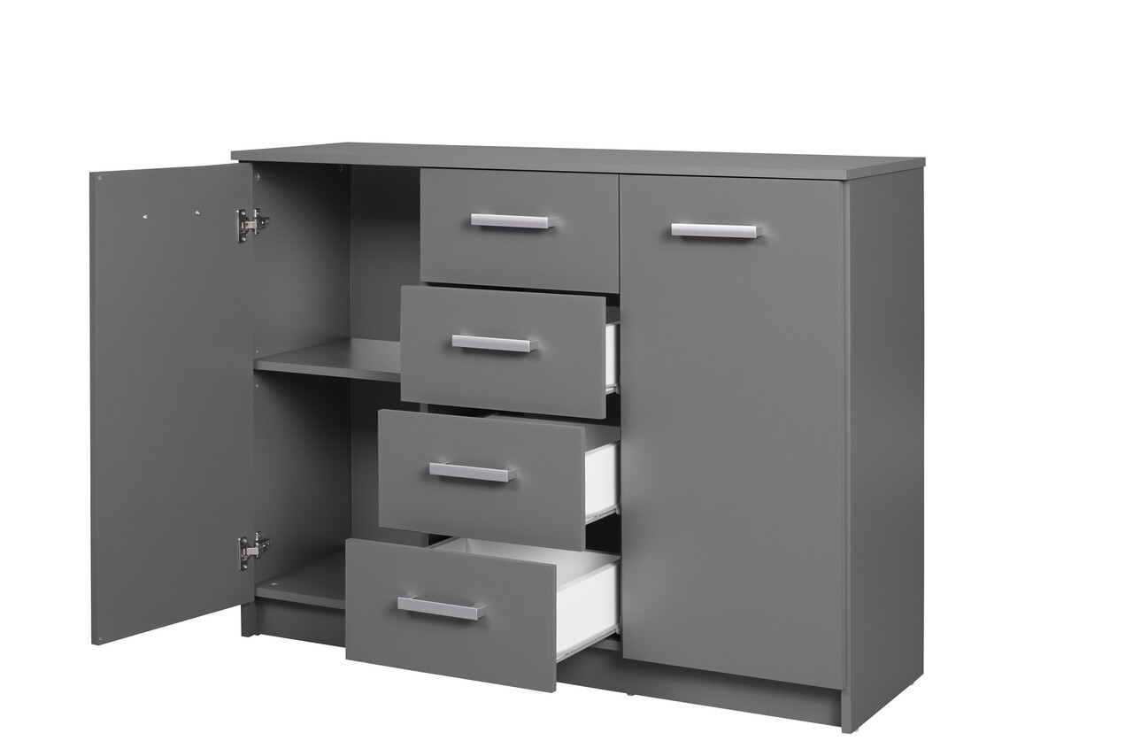 Comoda ELENZIO, fabricata din PAL melaminat, are doua usi, fiecare cu cate doua compartimente incastrate, si patru sertare pe sine, perfecte pentru depozitarea rechizitelor de birou sau a altor obiecte precum vase, lenjerie de pat, jocuri de societate si multe altele. Suprafata superioara este ideala pentru expunerea obiectelor decorative preferate. Poate fi folosita si ca comoda sau bufet intr-o sufragerie/living sau ca si comoda intr-un dormitor. Robusta si functionala, finisajul sau gri grafit adauga o nota moderna oricarui apartament sau case.