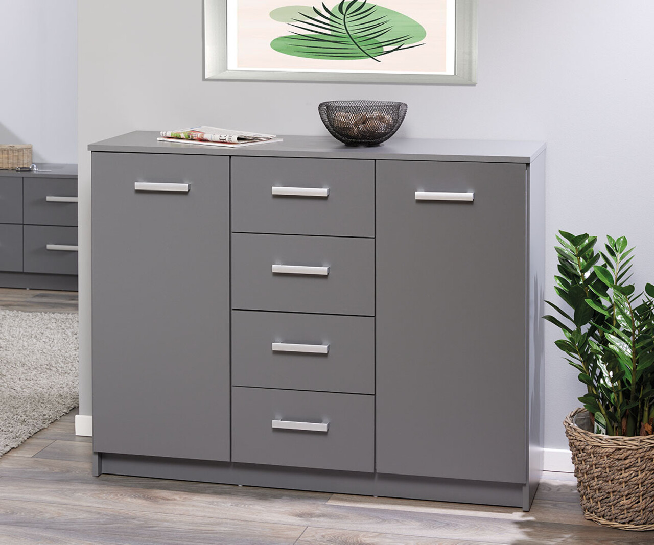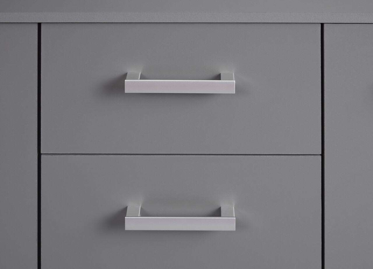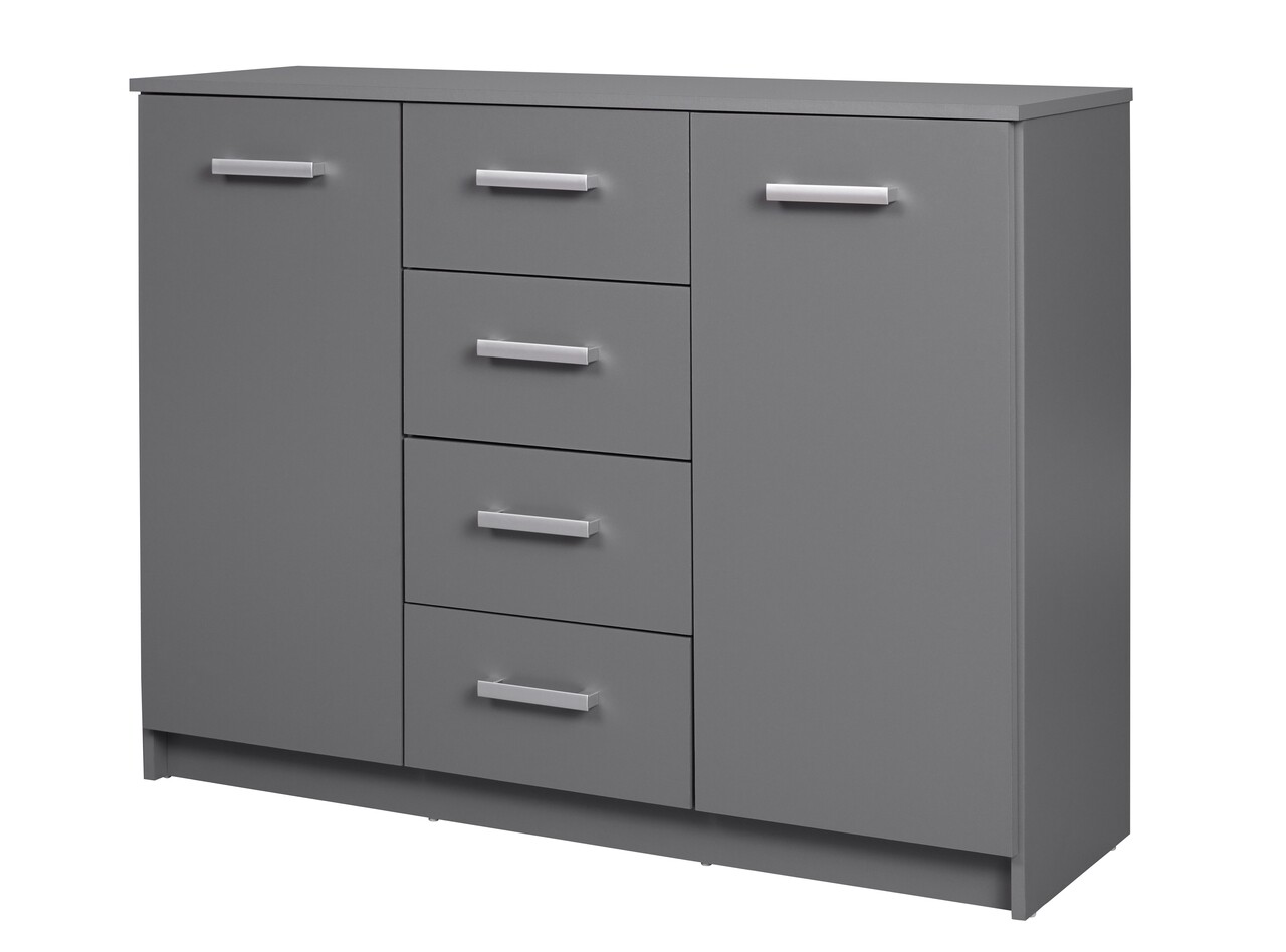 Comoda ELENZIO, fabricata din PAL melaminat, are doua usi, fiecare cu cate doua compartimente incastrate, si patru sertare pe sine, perfecte pentru depozitarea rechizitelor de birou sau a altor obiecte precum vase, lenjerie de pat, jocuri de societate si multe altele. Suprafata superioara este ideala pentru expunerea obiectelor decorative preferate. Poate fi folosita si ca comoda sau bufet intr-o sufragerie/living sau ca si comoda intr-un dormitor. Robusta si functionala, finisajul sau gri grafit adauga o nota moderna oricarui apartament sau case.