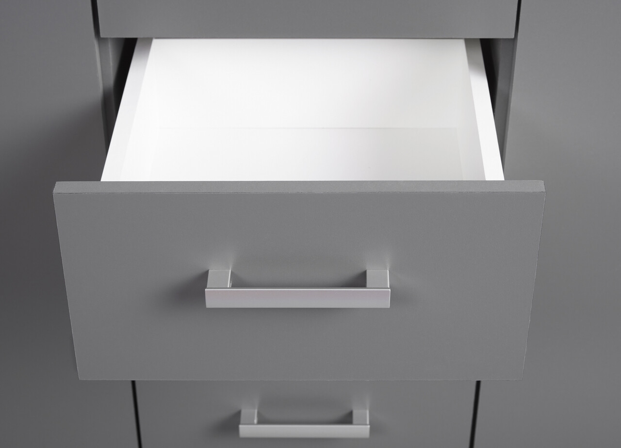 Aceasta comoda a fost conceputa pentru a se integra perfect in orice stil de decor si pentru a imbunatati orice camera din casa. Culoarea sa moderna gri grafit este accentuata de manerele gri-argintiu. Liniile sale curate reflecta tendintele actuale de design interior. O puteti combina cu biroul, raftul si alte comode din seria „ELENZIO” pentru a crea si mai mult spatiu de depozitare.