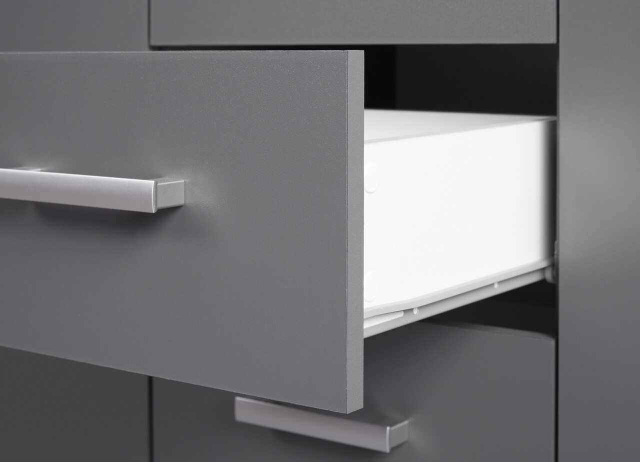 Comoda gri este fabricata din PAL acoperit cu plastic (KFB), melaminat si are sertare care se deschid usor pe sine metalice.