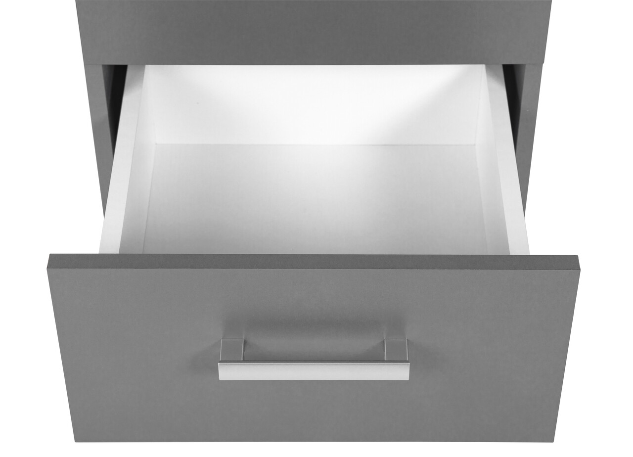 Comoda ELENZIO are trei sertare pe sine, perfecte pentru depozitarea rechizitelor de birou sau a altor obiecte precum dosare, carti si haine. Poate servi si ca noptiera intr-un dormitor sau ca valet pe hol. Suprafata superioara ofera o suprafata convenabila pentru expunerea decoratiunilor, lampilor sau ceasurilor desteptatoare preferate. Robusta si functionala, finisajul gri grafit al mesei adauga o nota moderna oricarei case.