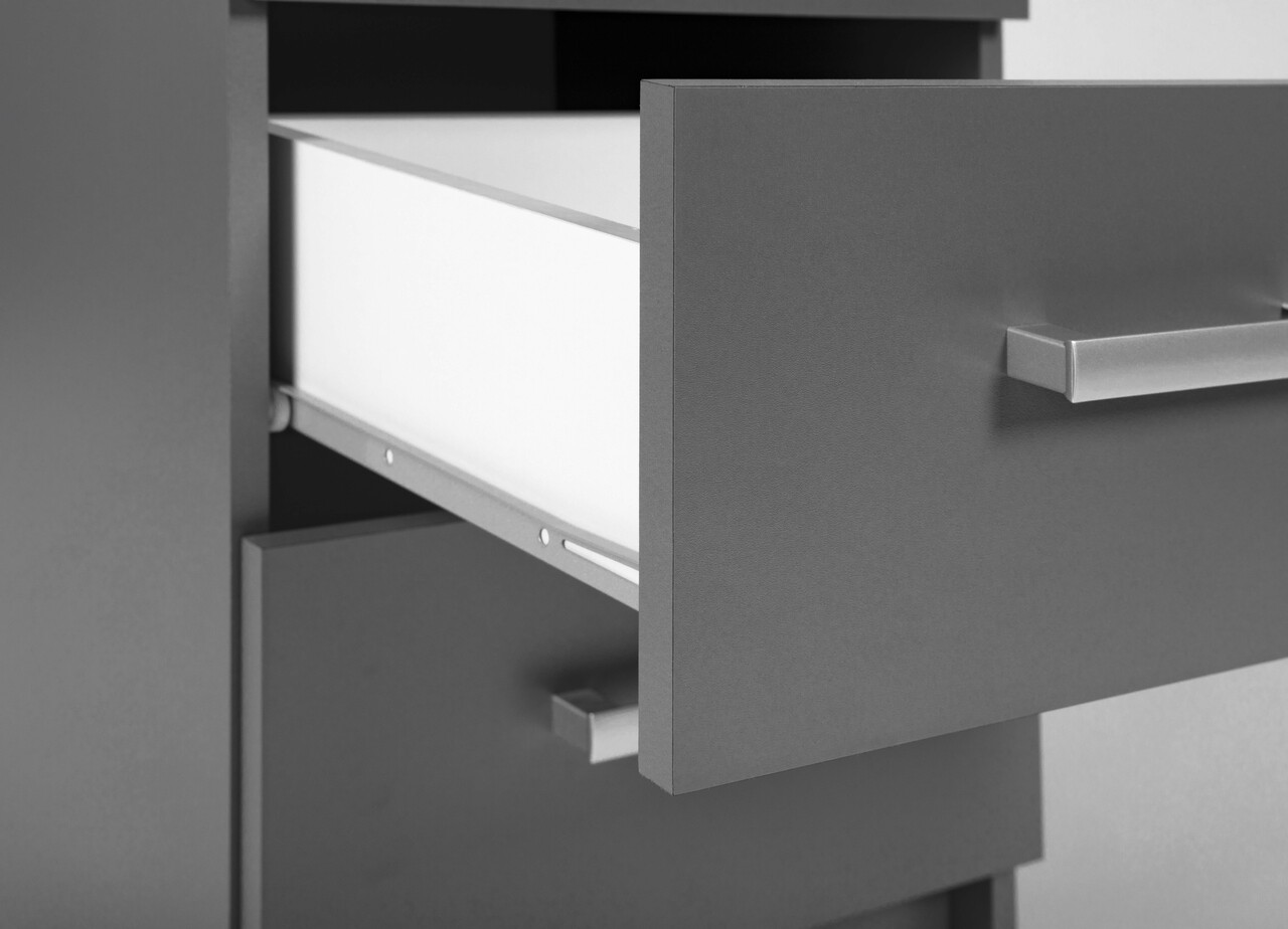 Comoda gri este fabricata din PAL plastifiat (KFB), are un finisaj melaminat si sertare cu glisare usoara pe sine metalice.