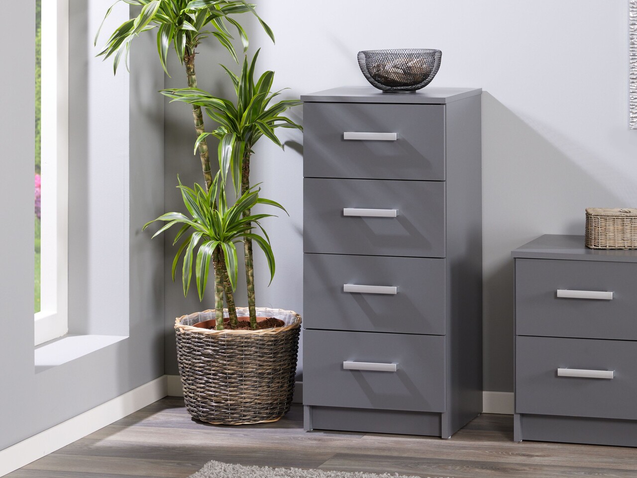 Seria Elenzio este atemporala si, cu culoarea sa moderna, combina o comoda clasica cu o nota moderna. Fabricata din MDF robust, cu un strat de melamina gri. Usor de curatat si extrem de durabila. Prezinta manere practice si atractive pe partea din fata a sertarelor. Patru sertare pe glisiere metalice cu glisare lina. Ideala si ca noptiera langa un pat cu somier!
