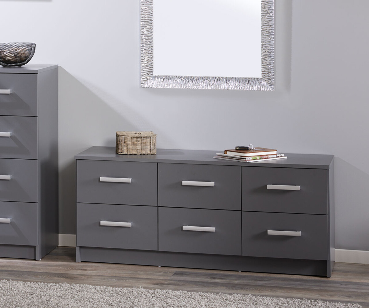 Comoda ELENZIO are sase sertare pe sine, perfecte pentru depozitarea rechizitelor de birou sau a altor obiecte precum dosare, carti si haine. Suprafata superioara este ideala pentru expunerea decoratiunilor preferate sau a unei veioze. Poate fi folosita si ca o comoda sau un bufet intr-o sufragerie sau in living. Robusta si functionala, finisajul sau gri grafit adauga o nota moderna casei tale.