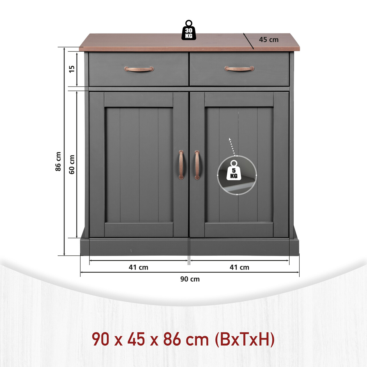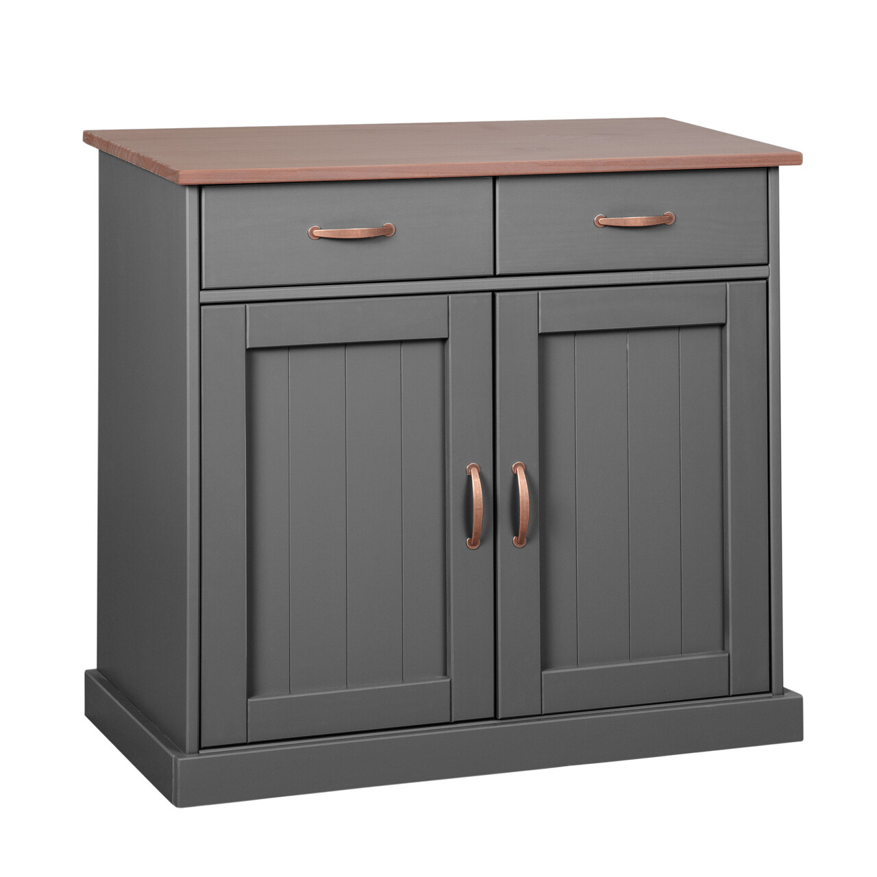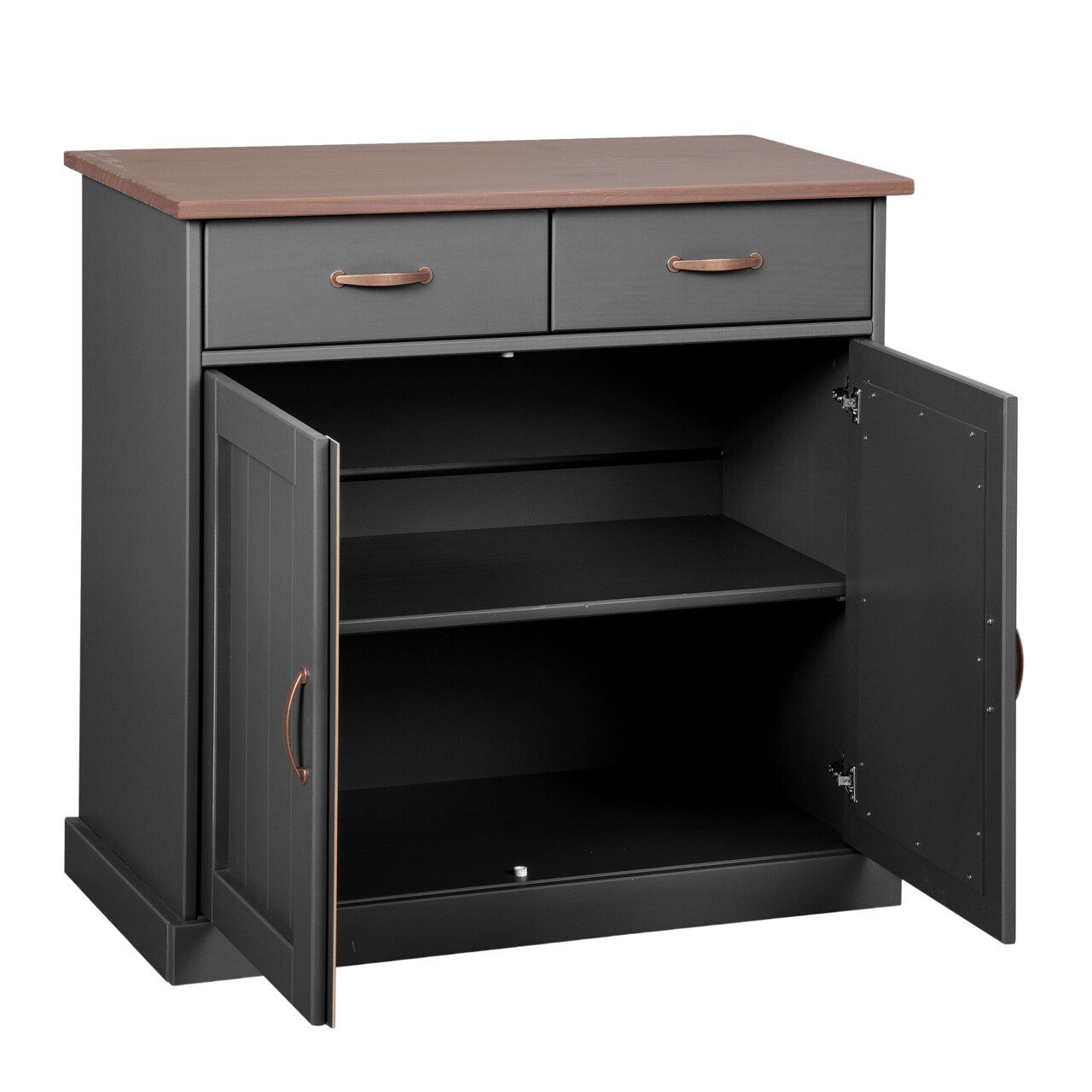 Aceasta frumoasa unitate de depozitare cu manere metalice de culoarea cuprului are doua sertare pe glisiere metalice care se deschid usor si un raft in spatele a doua usi. Deoarece satisfactia clientilor este prioritatea noastra principala, toate piesele noastre de mobilier sunt fabricate in conformitate cu standardele de mediu si de calitate. Toate piesele noastre de mobilier sunt inovatoare, practice si durabile, asigurandu-le ca vor rezista multi ani.