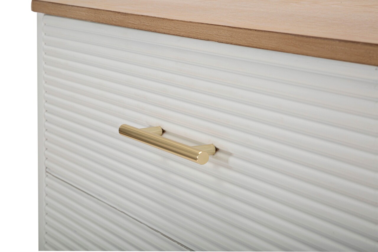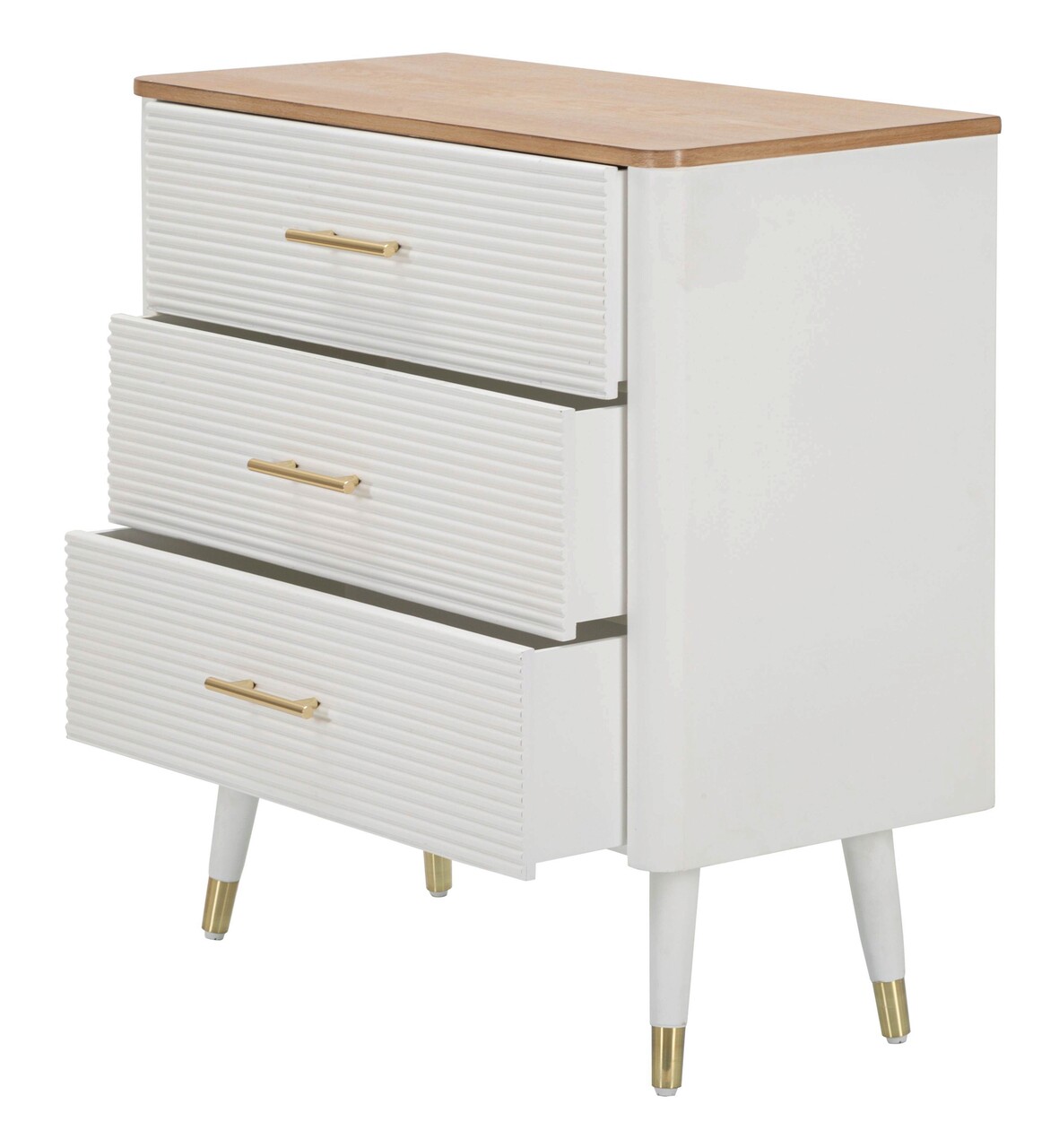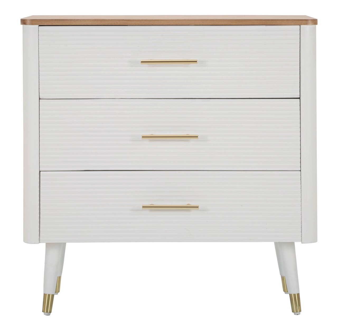 Comoda din lemn alb cu linii simple cu 3 sertare si blat din lemn maro. Manerele si picioarele din metal auriu ii confera o nota de eleganta. Dimensiuni interioare pentru sertar: 67 x 29 x 17 cm. Inaltime picioare: 21 cm. Compozitie material: lemn de frasin, lemn de pin, MDF, fier.