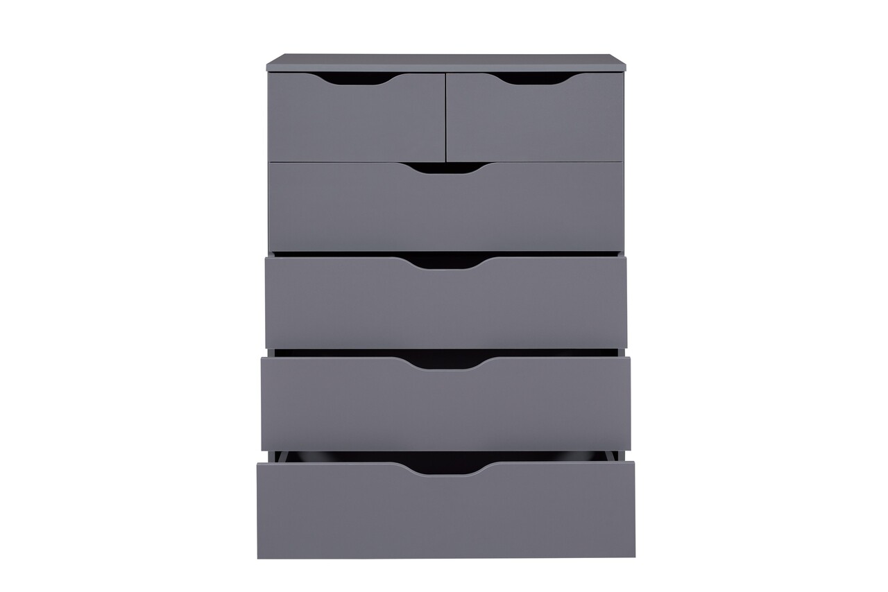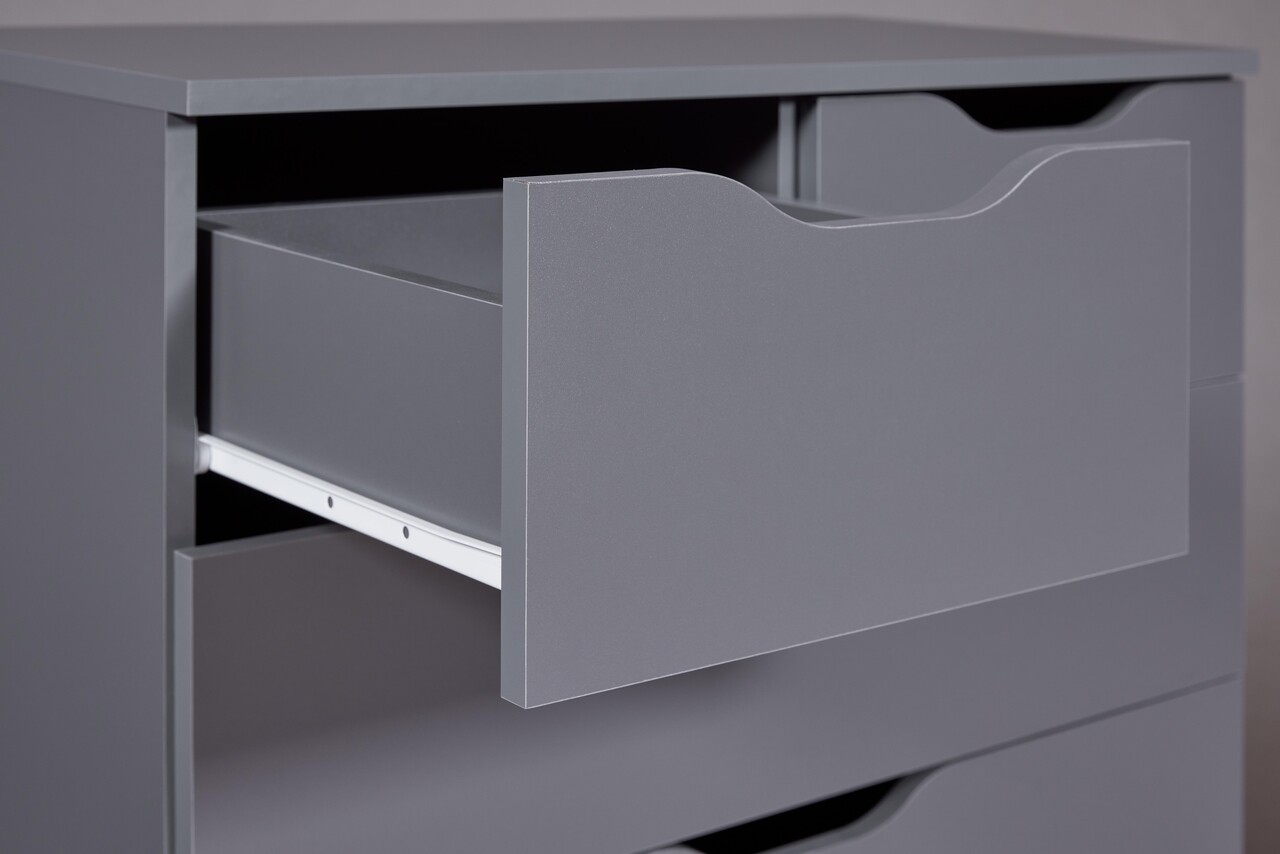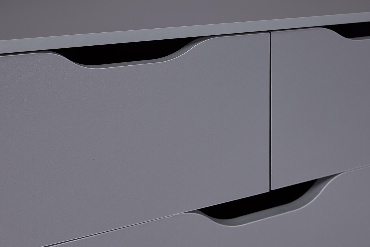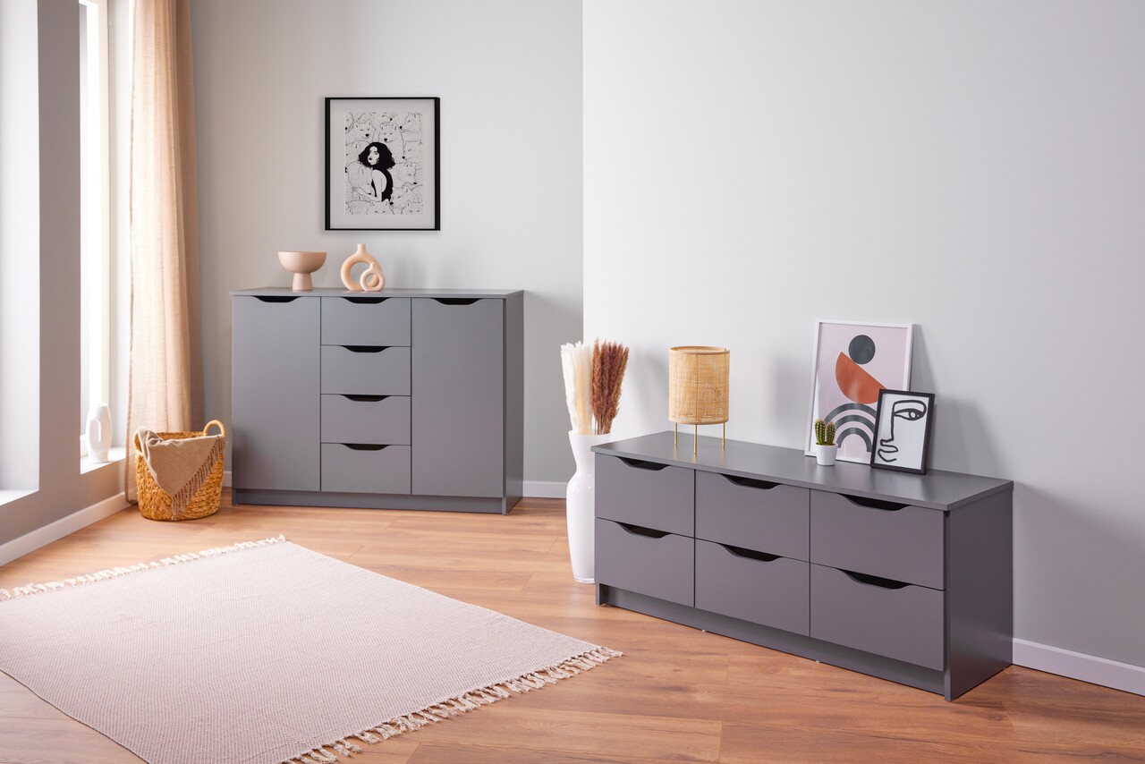 Silenzia este o comoda cu sertare care ofera mai multe avantaje! Aceasta comoda cu depozitare, cu designul sau atemporal, este ideala ca piesa de mobilier complementara in dormitor si living. Silenzia creeaza o baza calma pentru un stil interior delicat si atemporal, care poate fi combinat intr-o varietate de moduri. Patru sertare mari si doua mici pe sine metalice cu glisare usoara ofera un spatiu amplu de depozitare. Suprafata superioara este la o inaltime optima si permite nenumarate variatii in amplasarea obiectelor decorative.