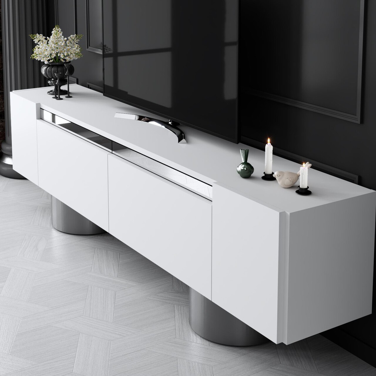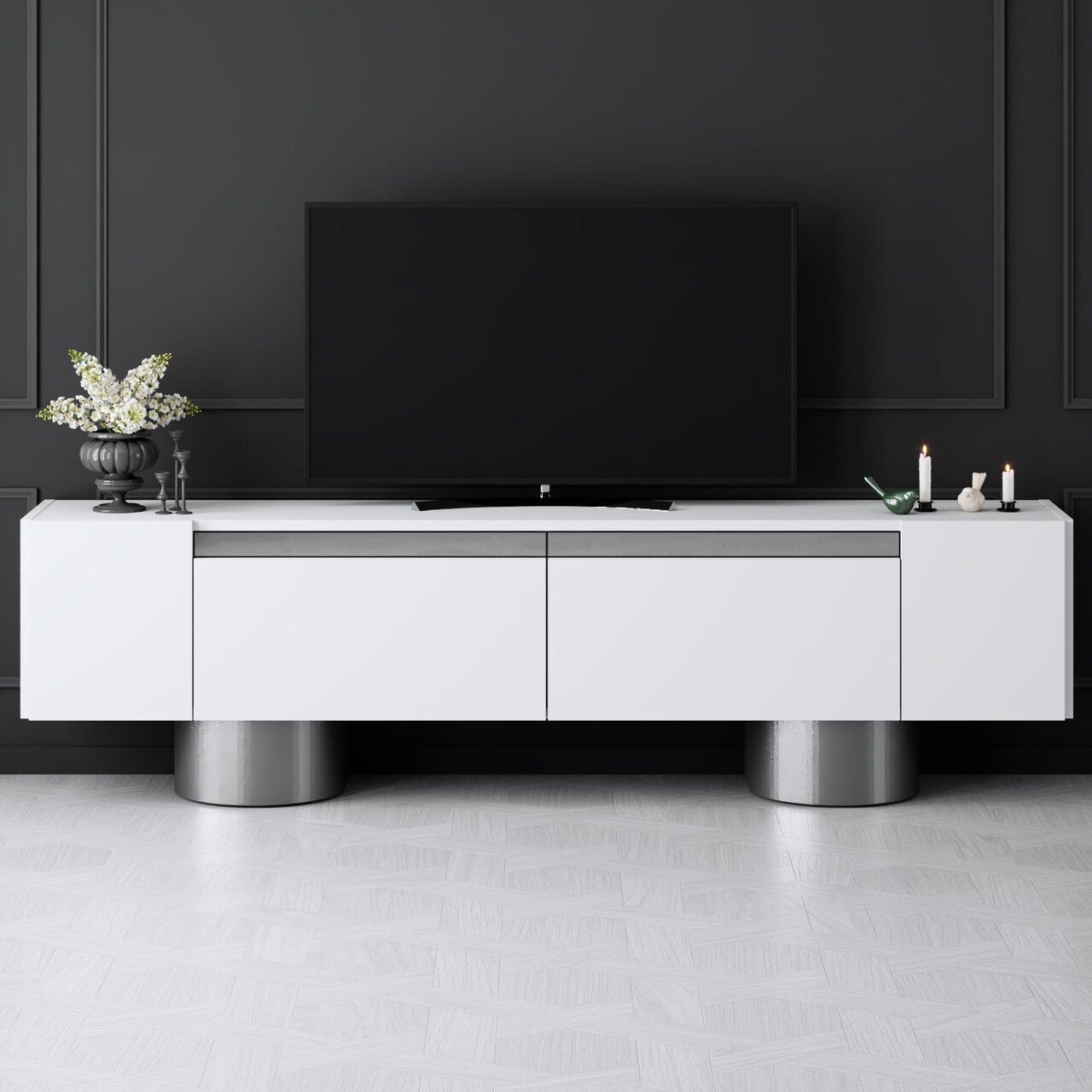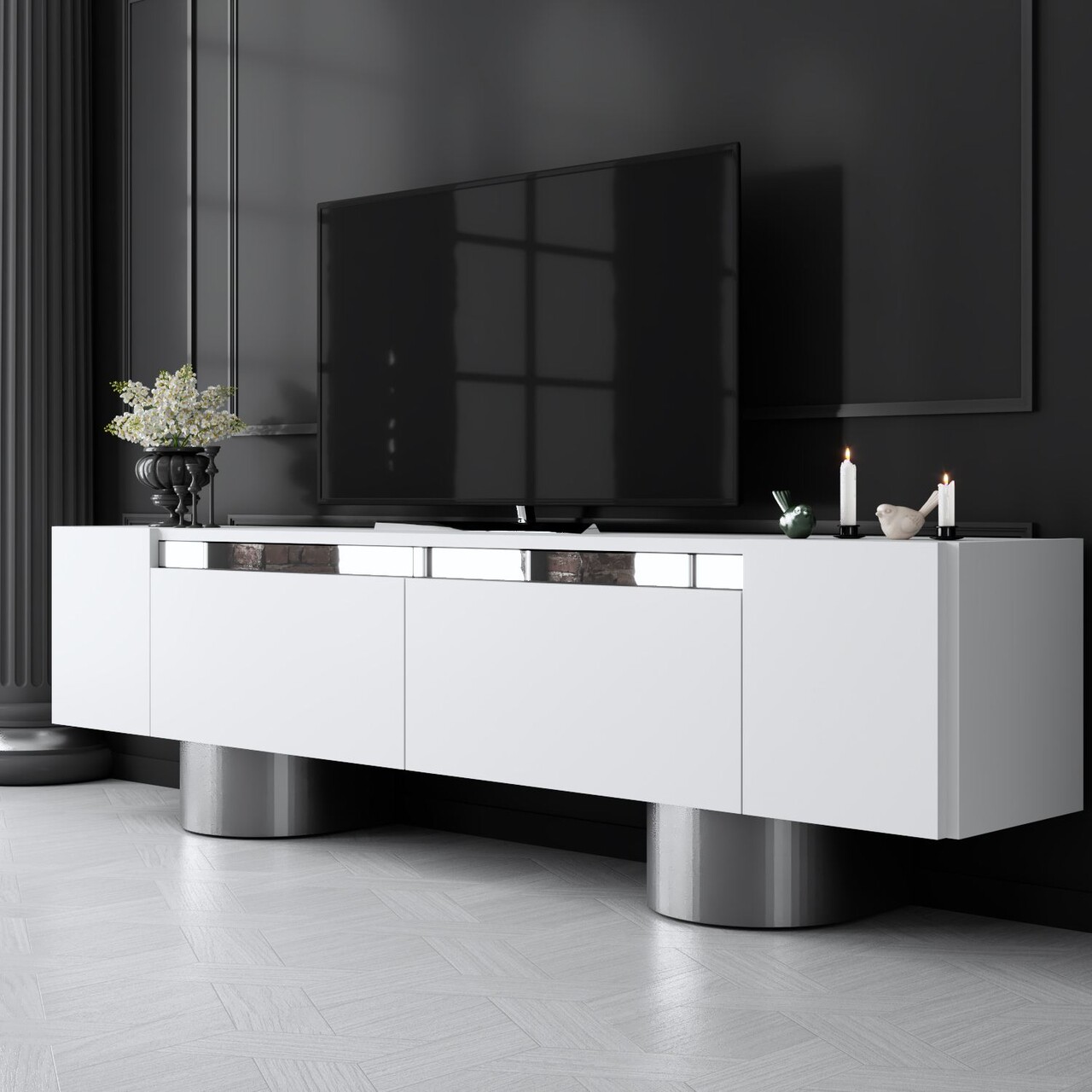 Comoda TV, Bexley, Bohem, 180x50x30 cm, PAL, Alb / Argintiu