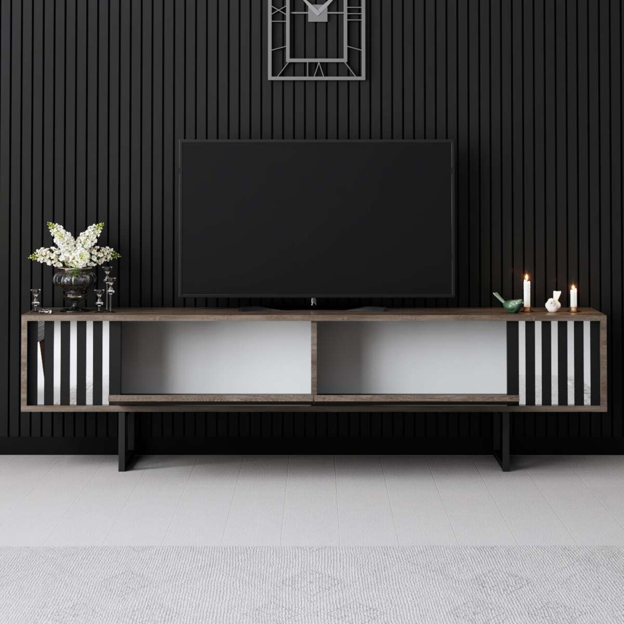 Comoda TV, Bexley, Chrome Line, 180x30x48 cm, PAL, Nuc / Negru