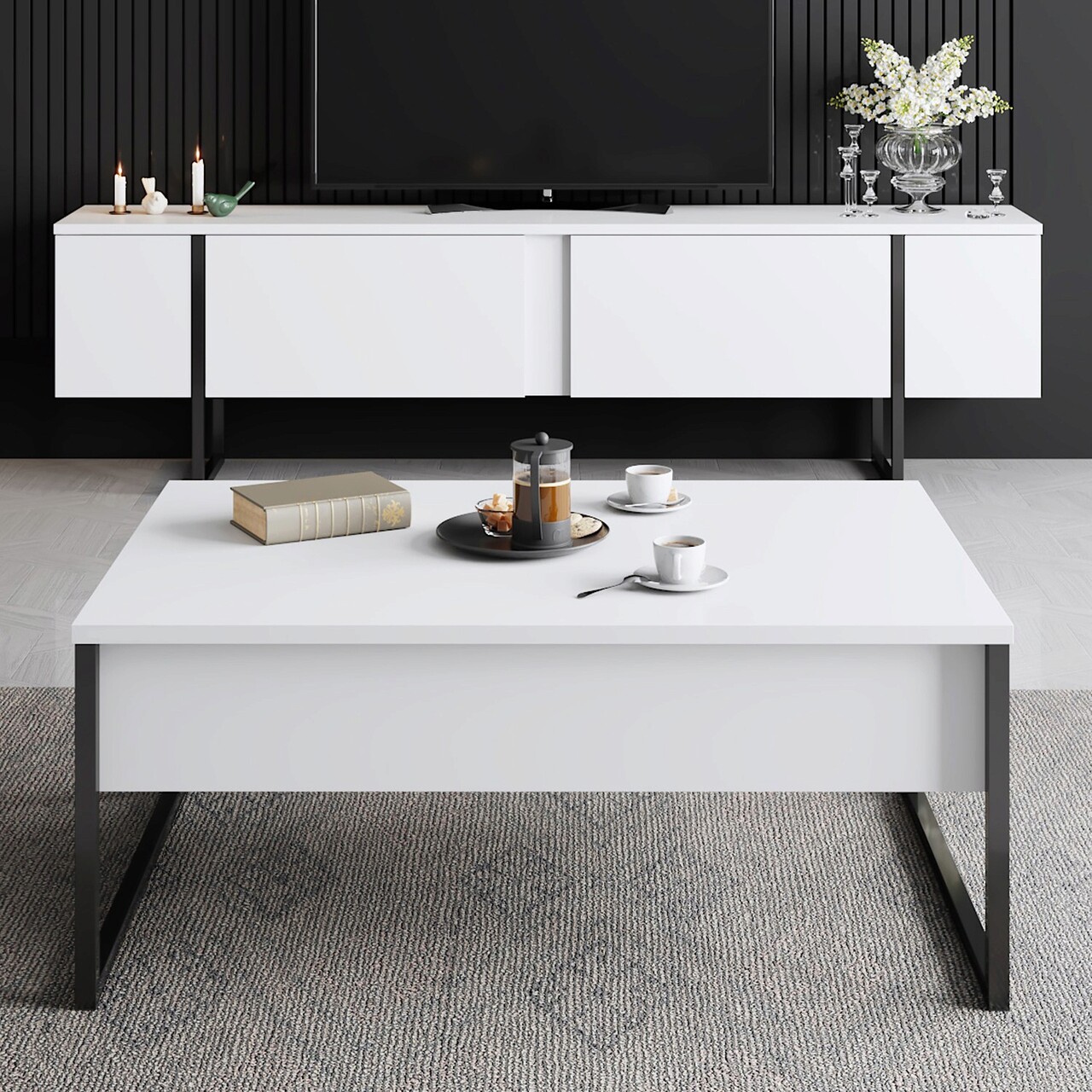 Comoda TV, Bexley, Luxe, 180x30x50 cm, PAL, Alb/Negru